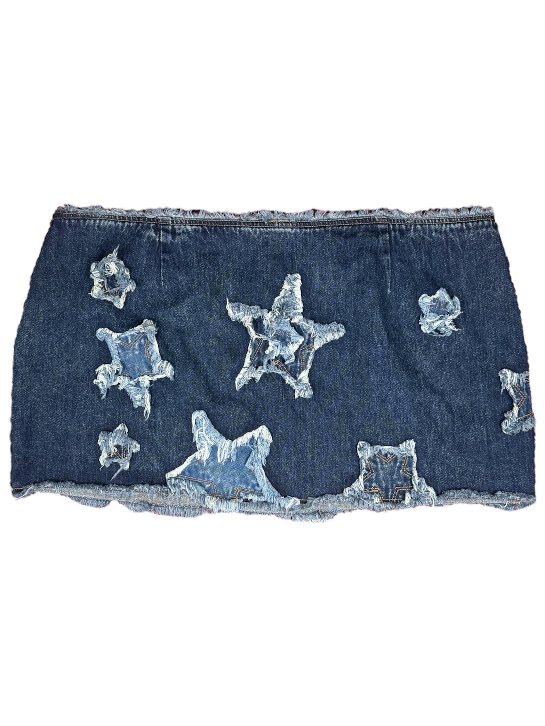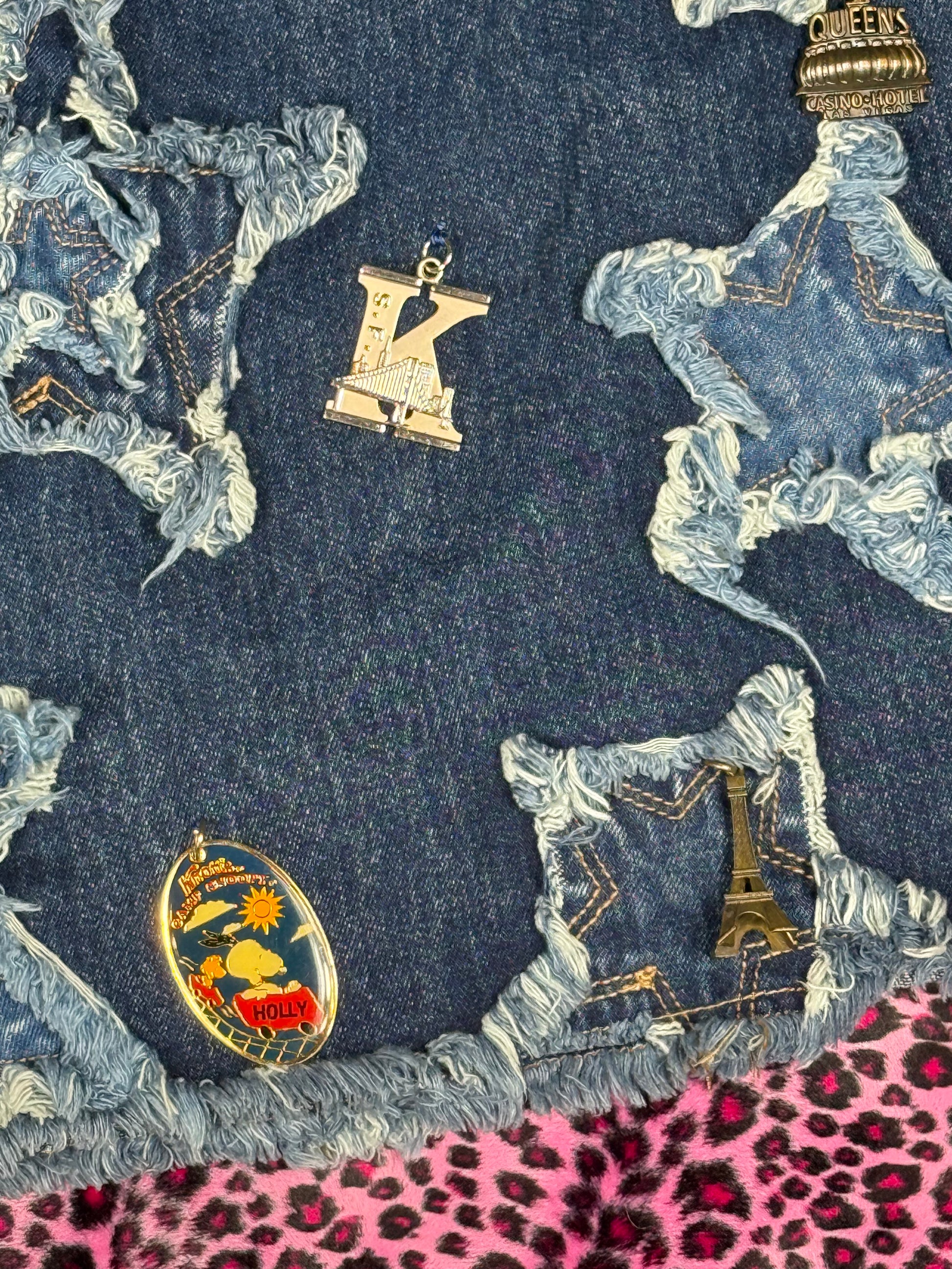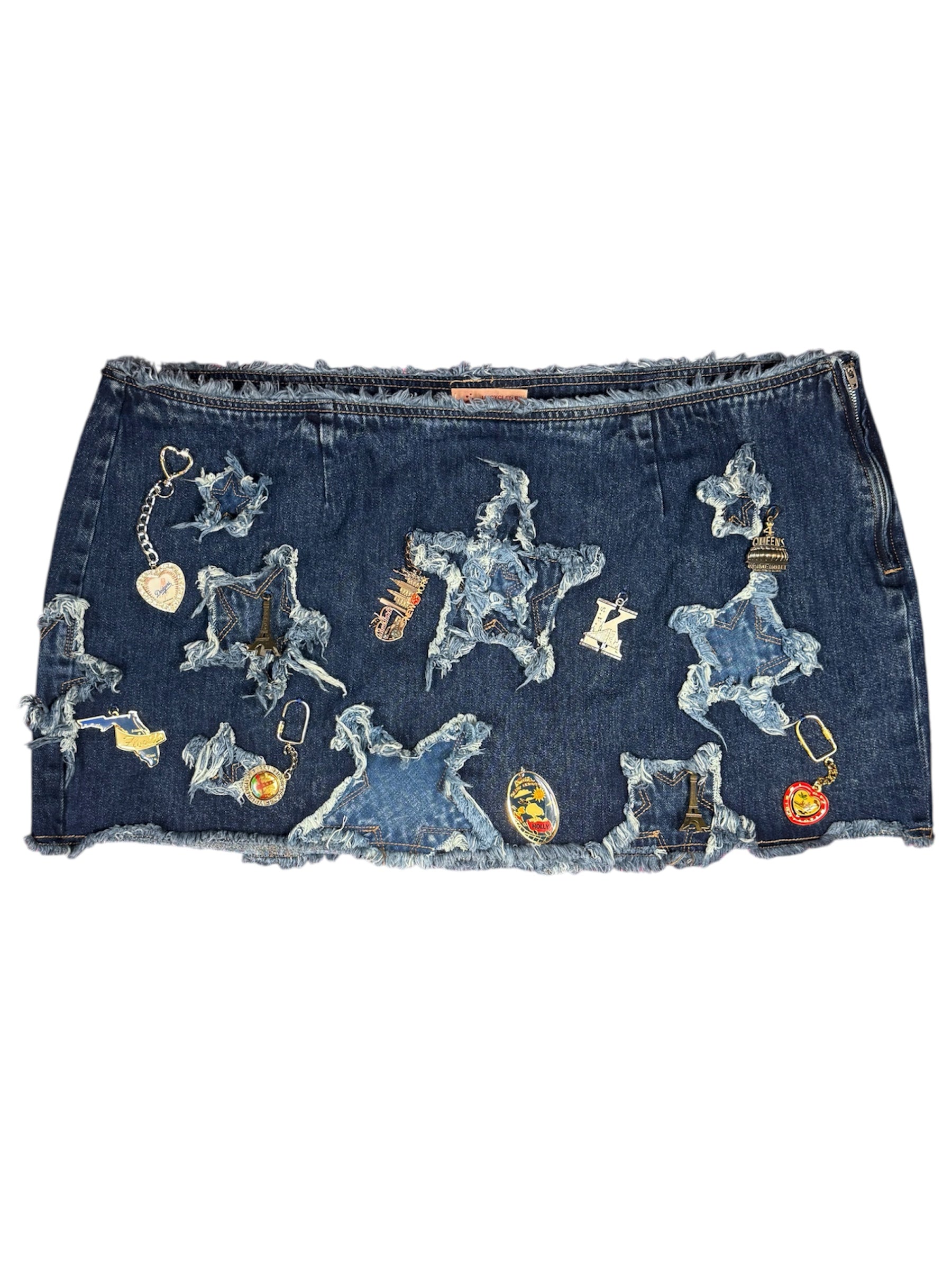 Upcycled denim mini skirt l Hand sewn keychain details l Frayed star patches l side zip