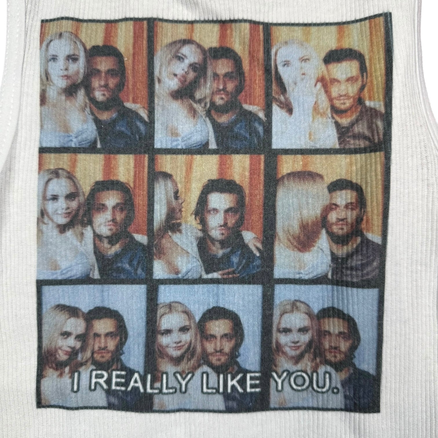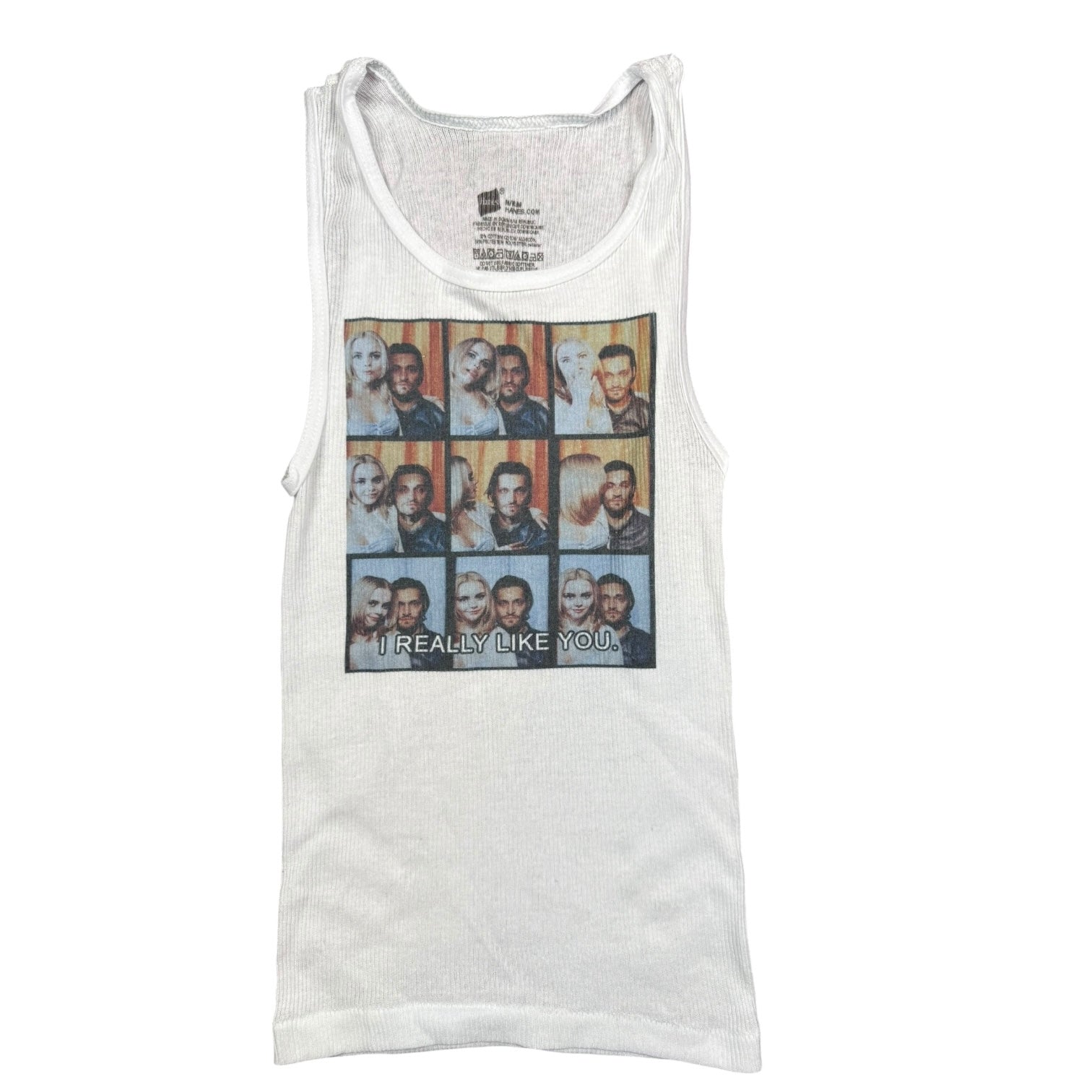 Custom hand printed design on ribbed tank. Can be long or cropped like photos shown.
