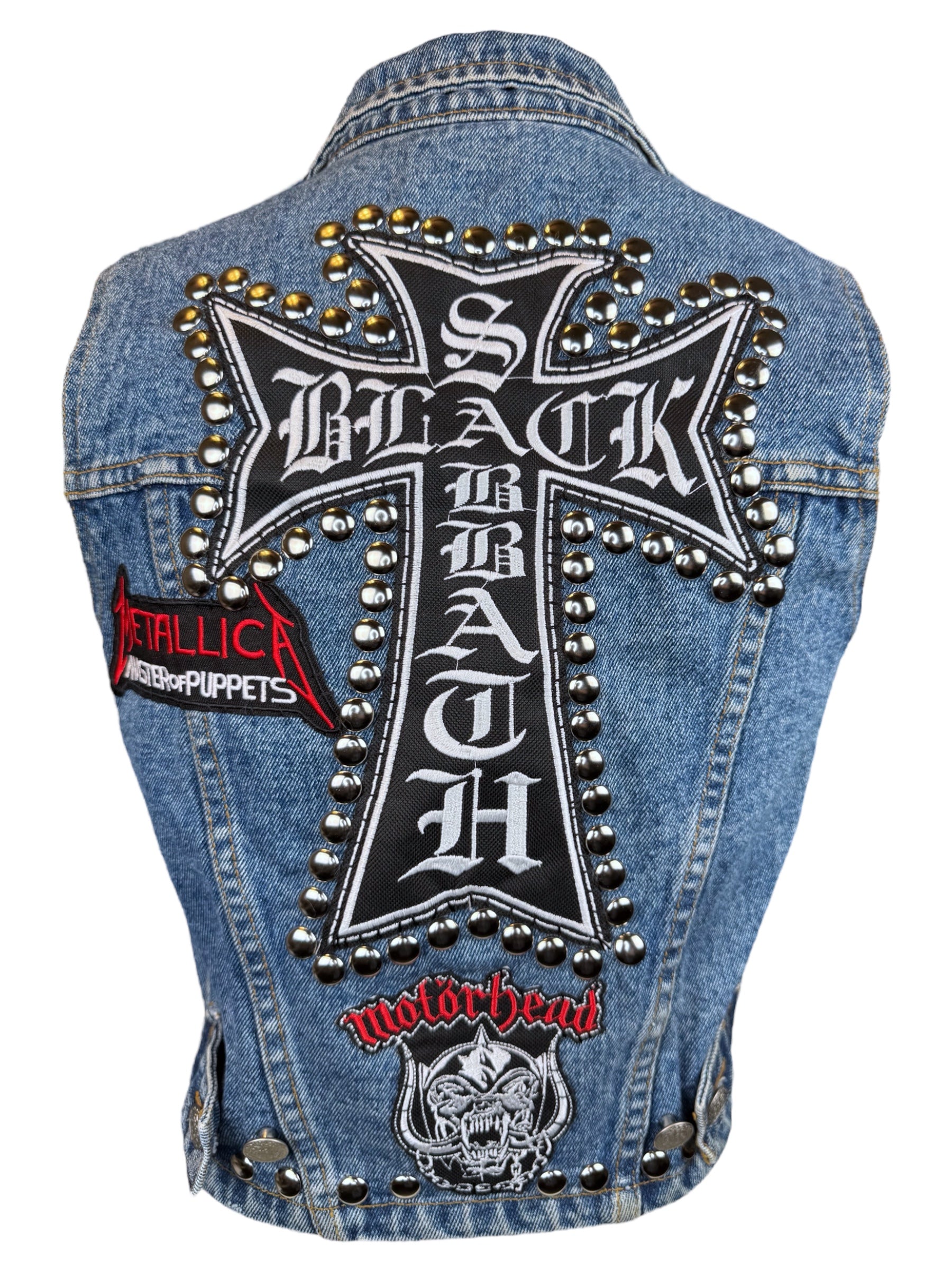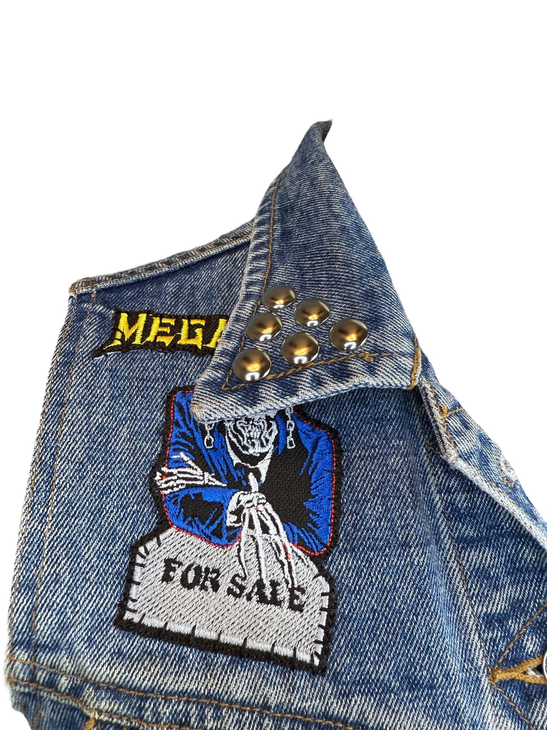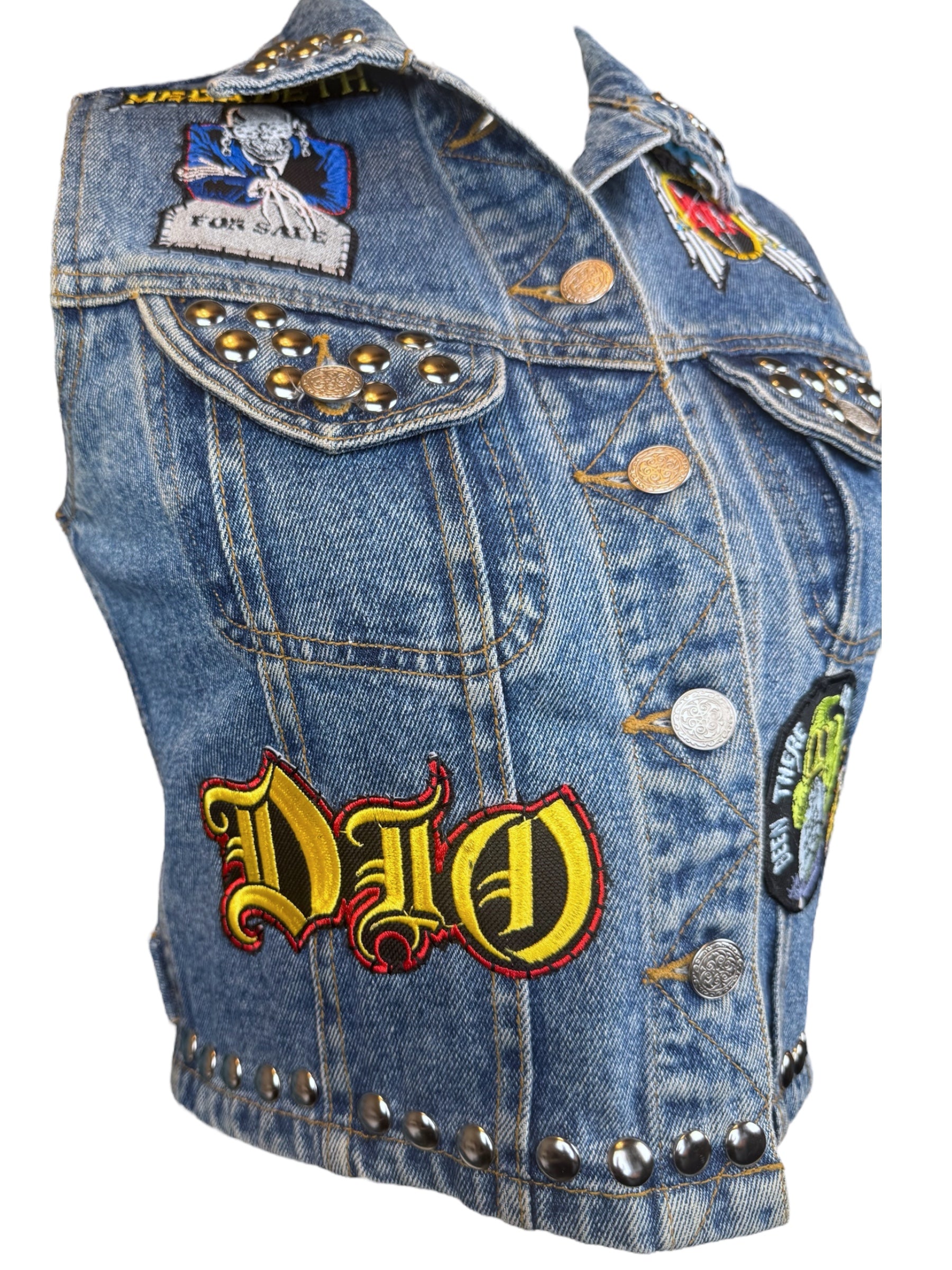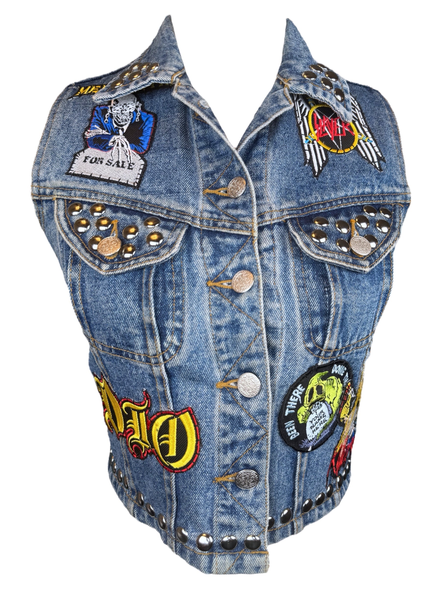 Upcycled Y2K denim vest with hand studded and hand sewn patches l marked a size XS l perfect for a lil baby metalhead l