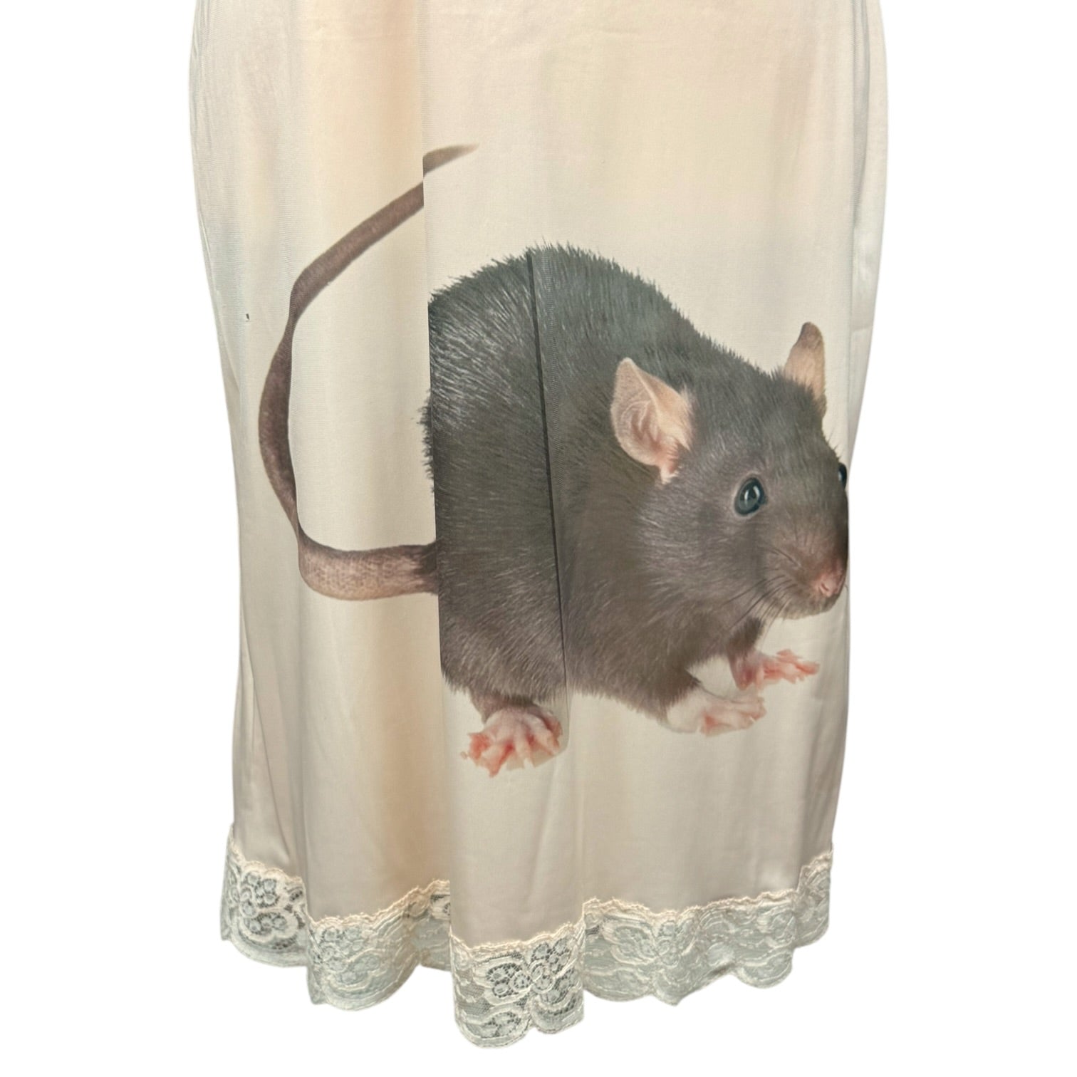 Upcycled slip dress with hand printed design l sheer l lace on hems l small hole near image as shown in photo