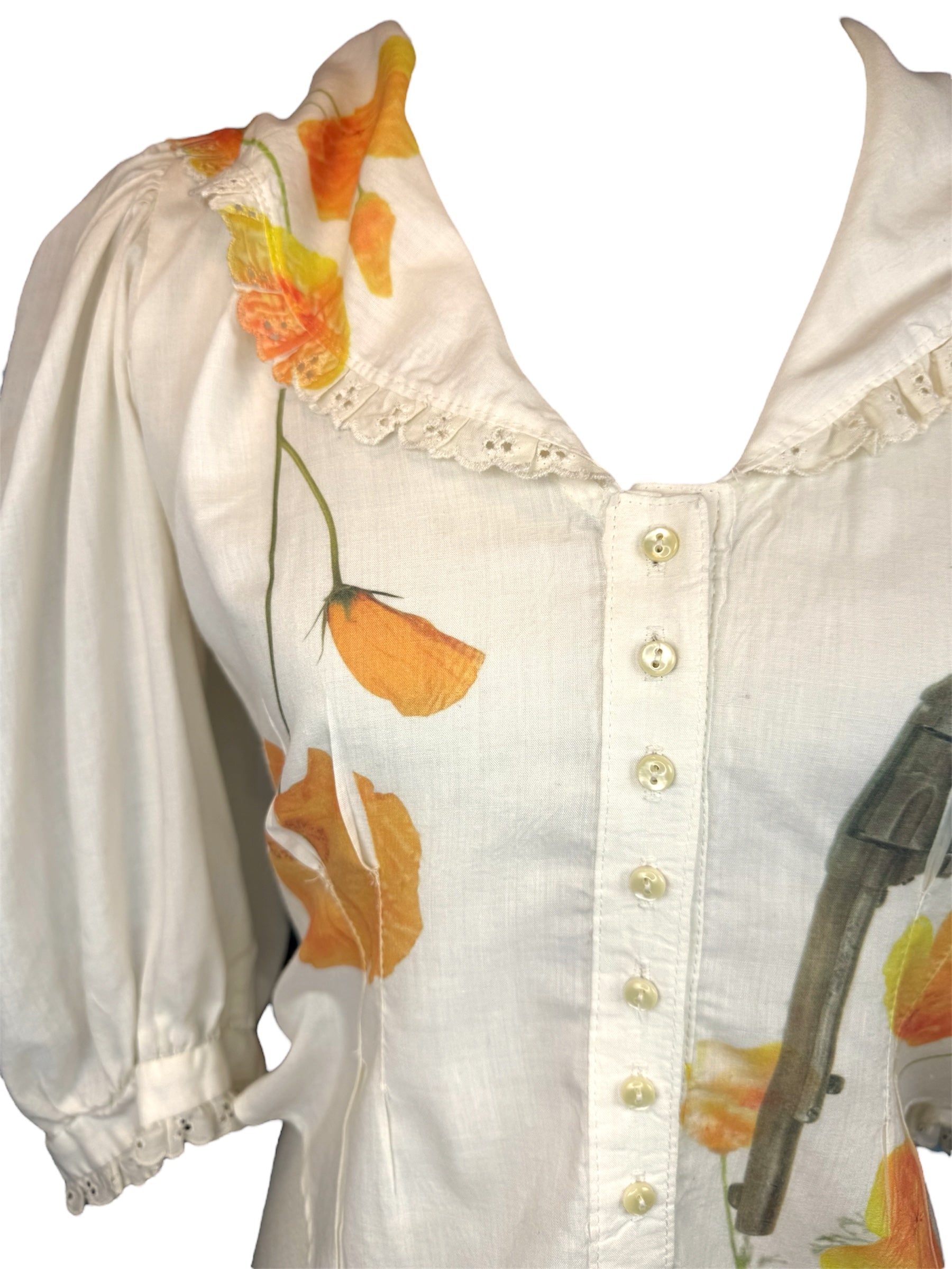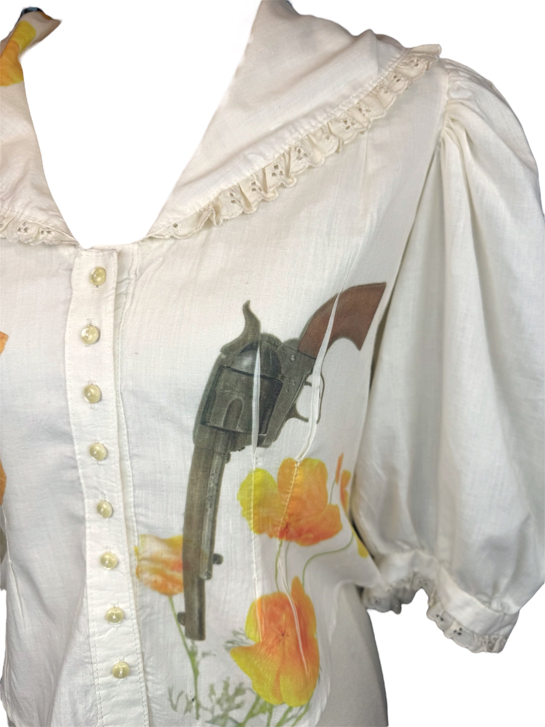 Upcycled with hand printed design on 70s/80s eyelet button up