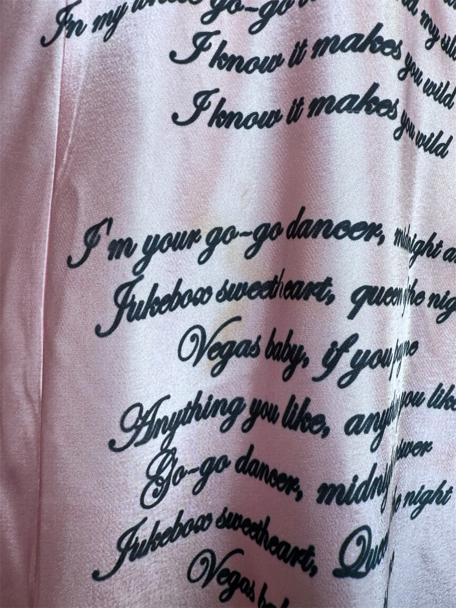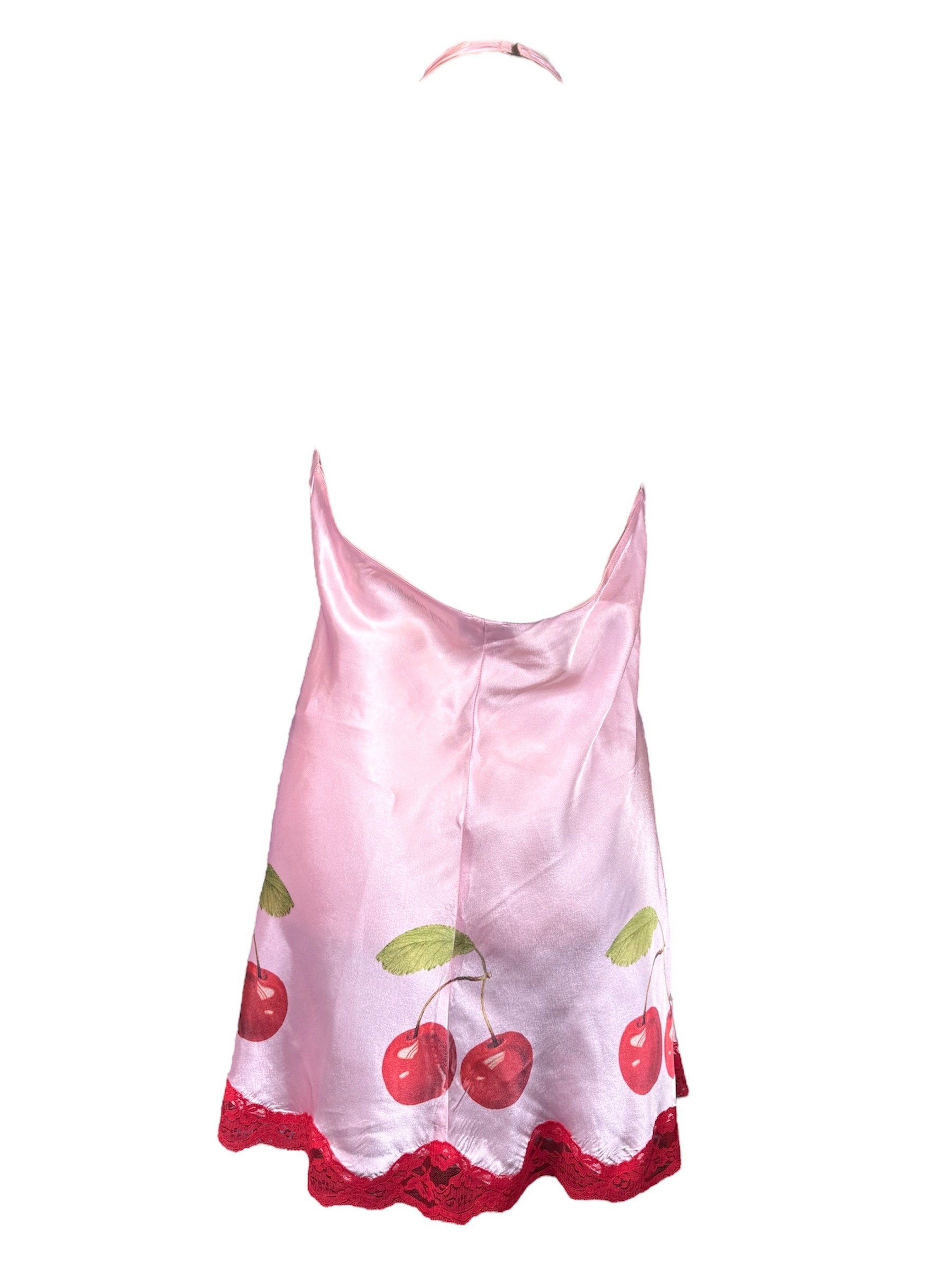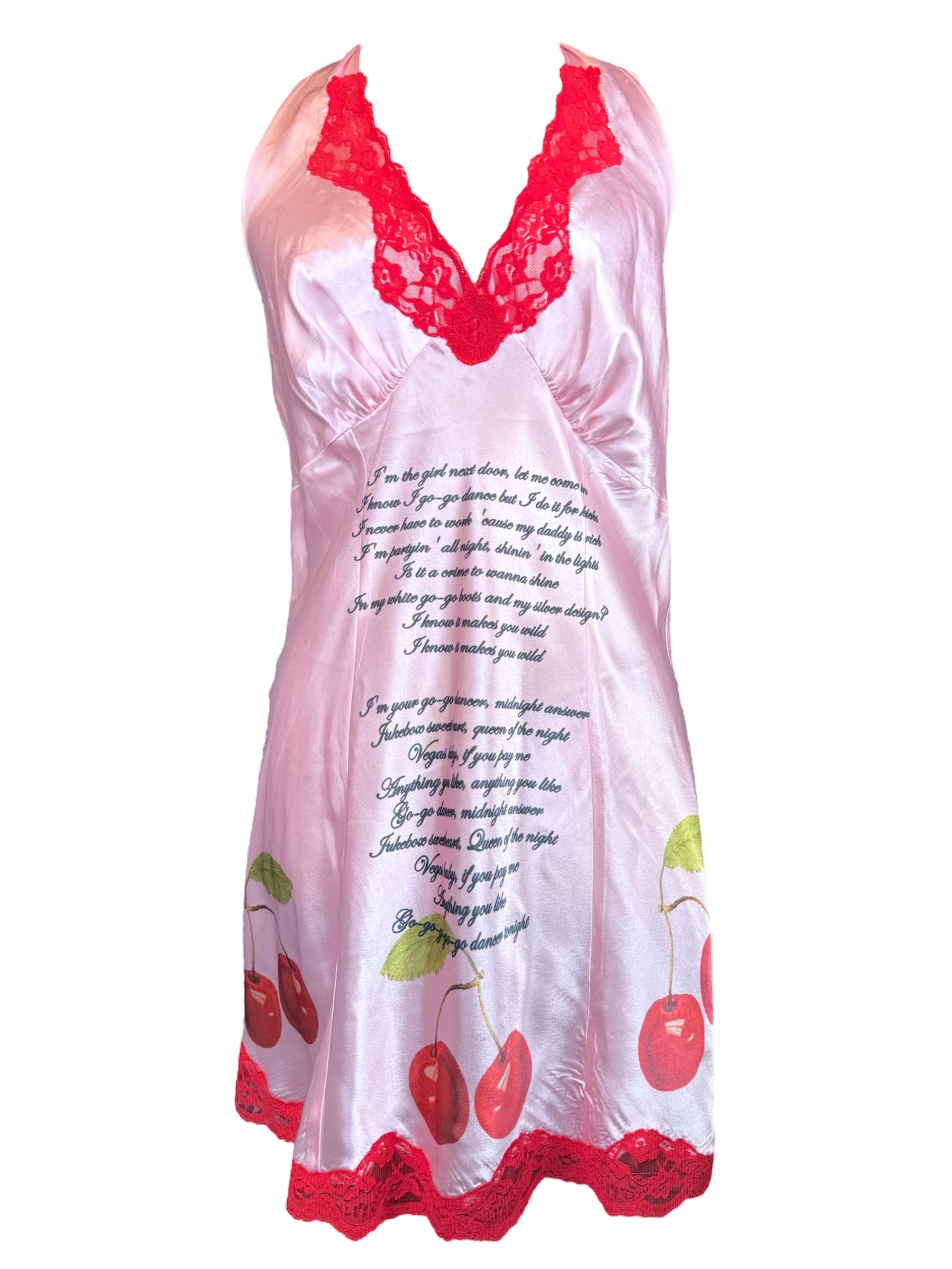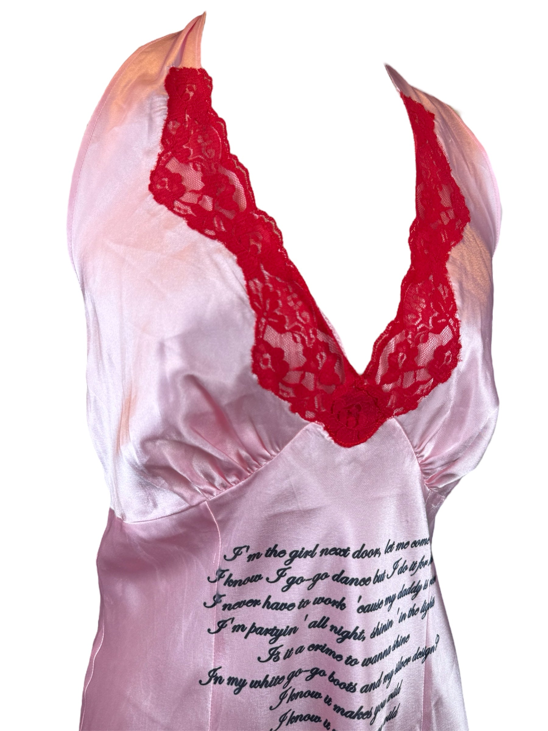 Upcycled lace slip with hand printed details l clasp halter l small stain on front near text, shown in photo