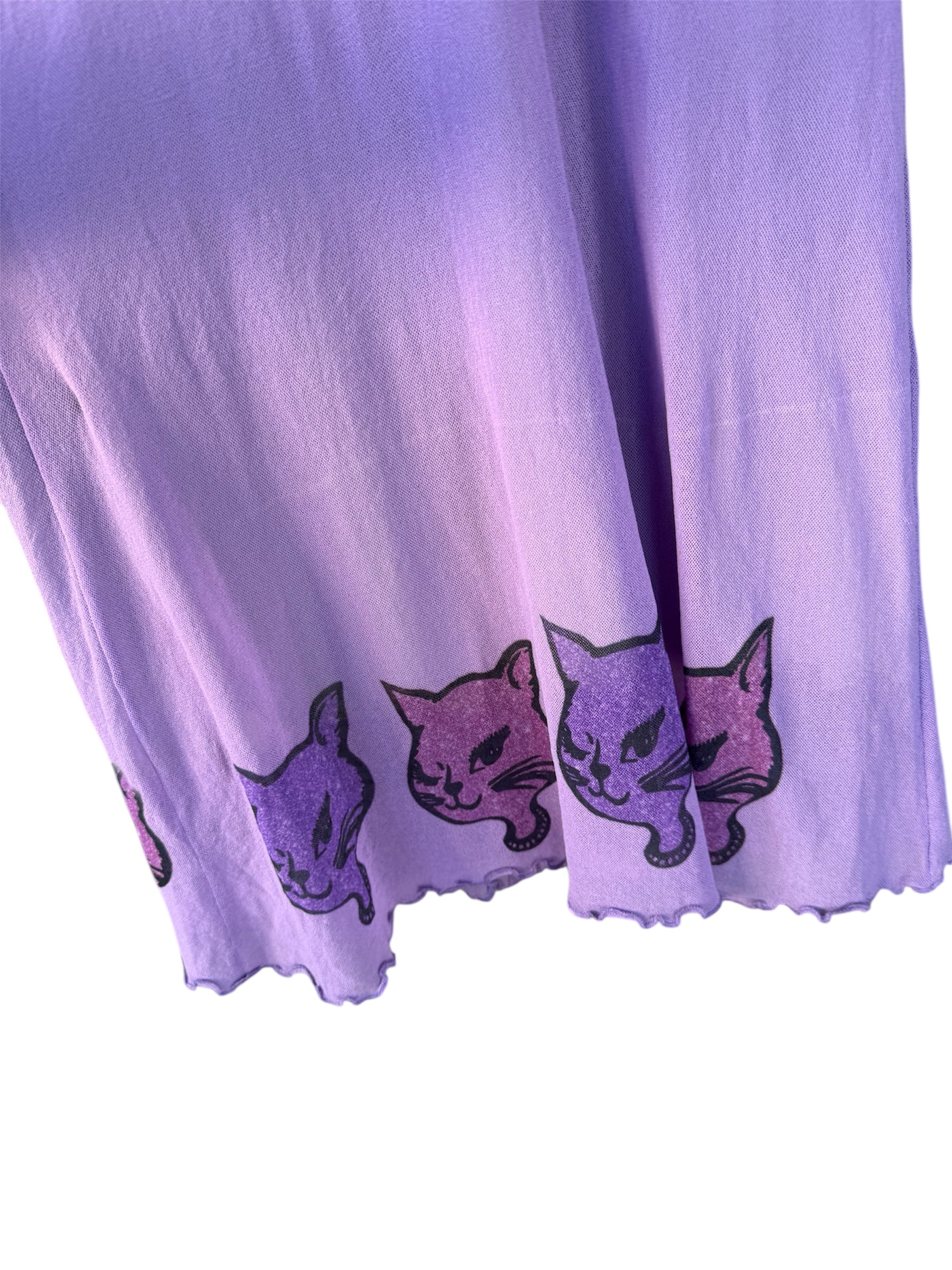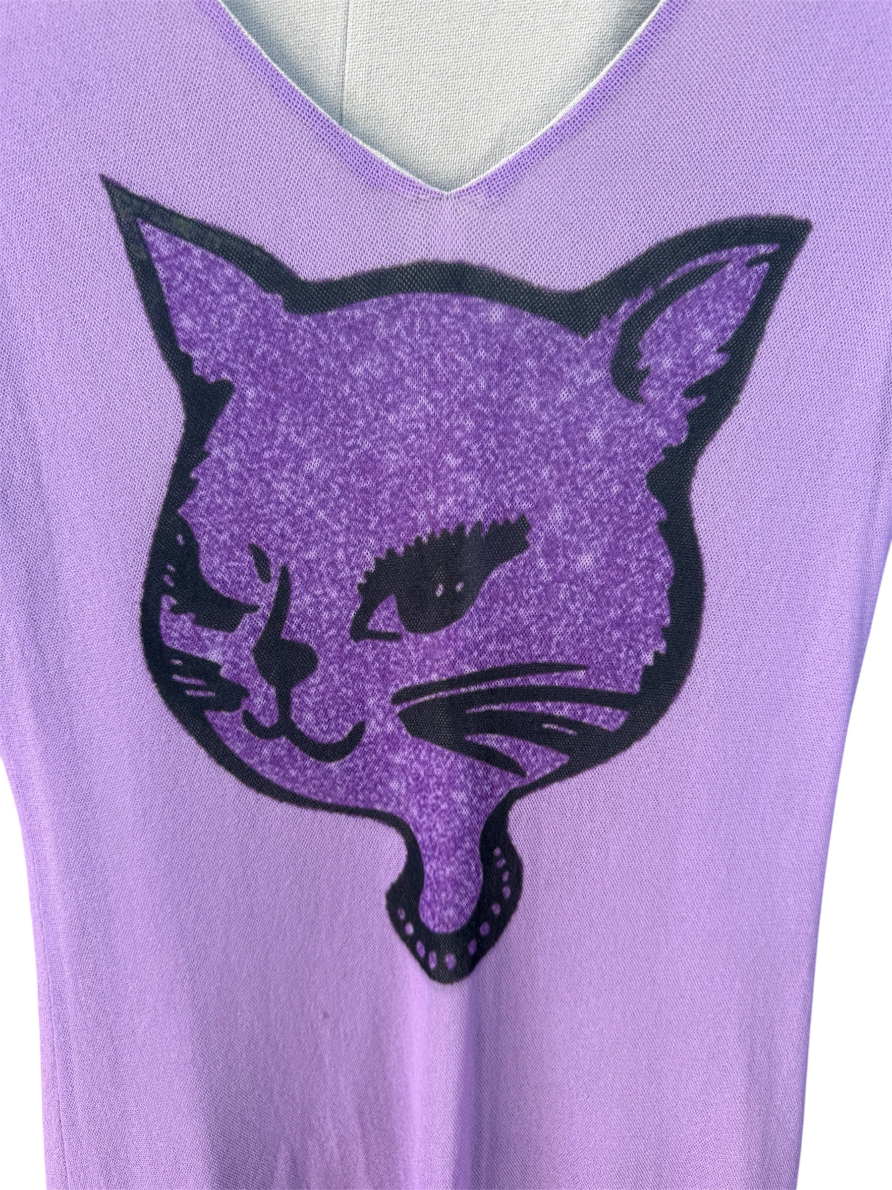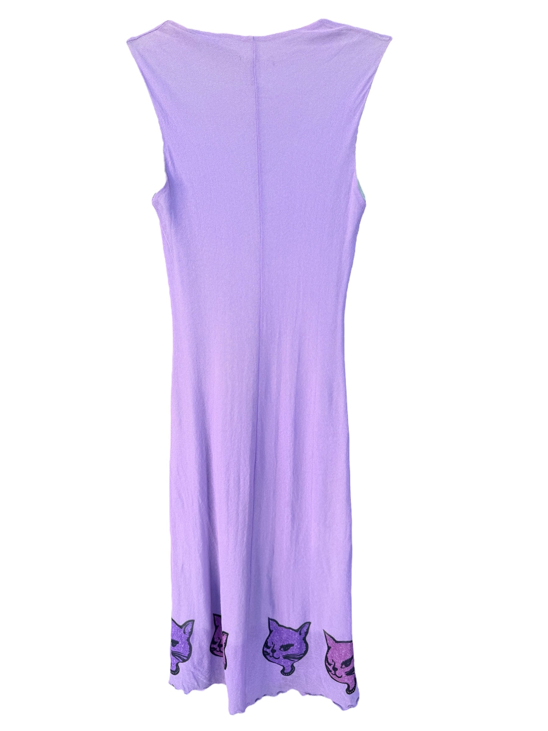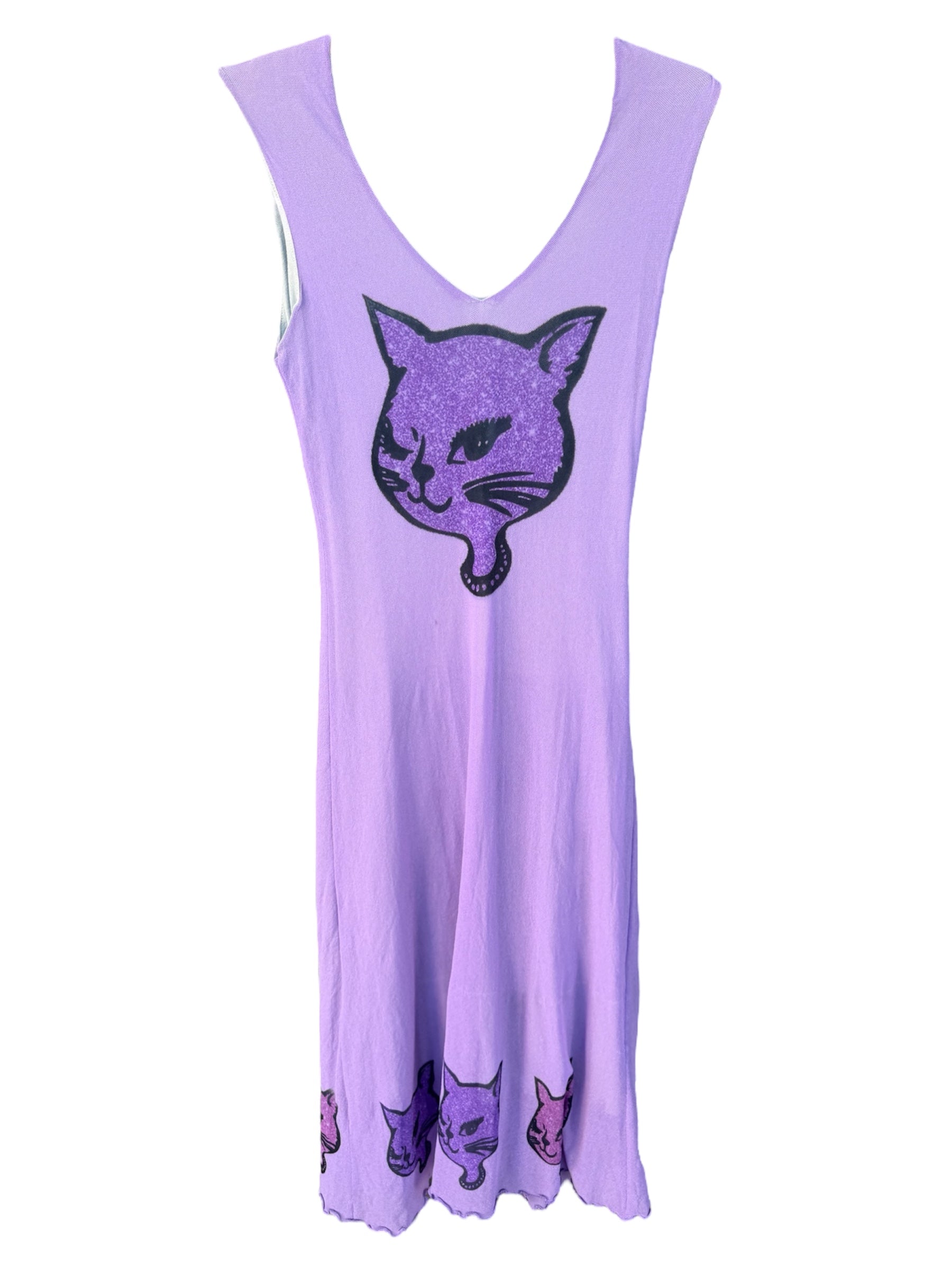 Upcycled moda international dress with hand printed images l stretchy l double lined l marked a size small