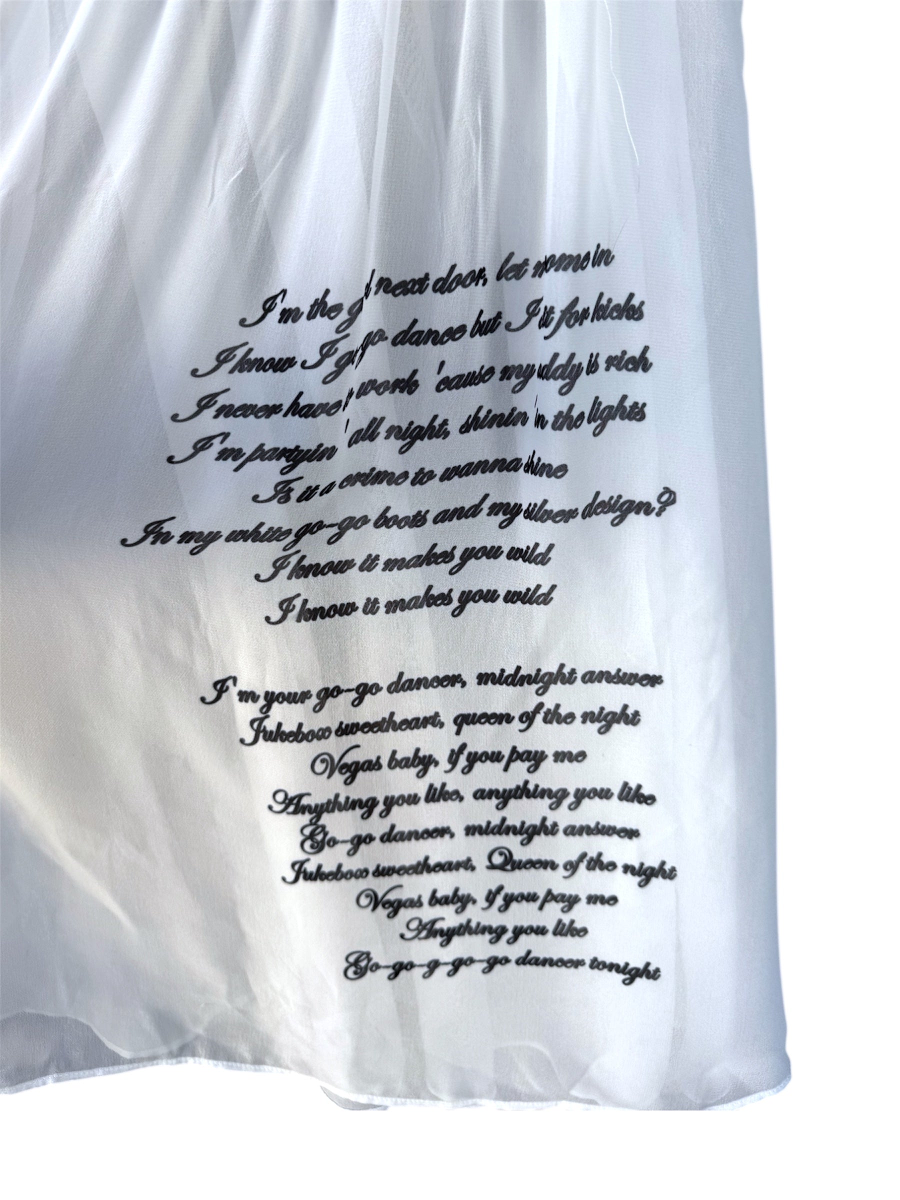 vintage slip dress with hand printed images l adjustable straps l elastic waistband lace, sequin, and beaded details l tie back l lyrics to Lana Del Rey Go Go Dancer for the die hards <3
