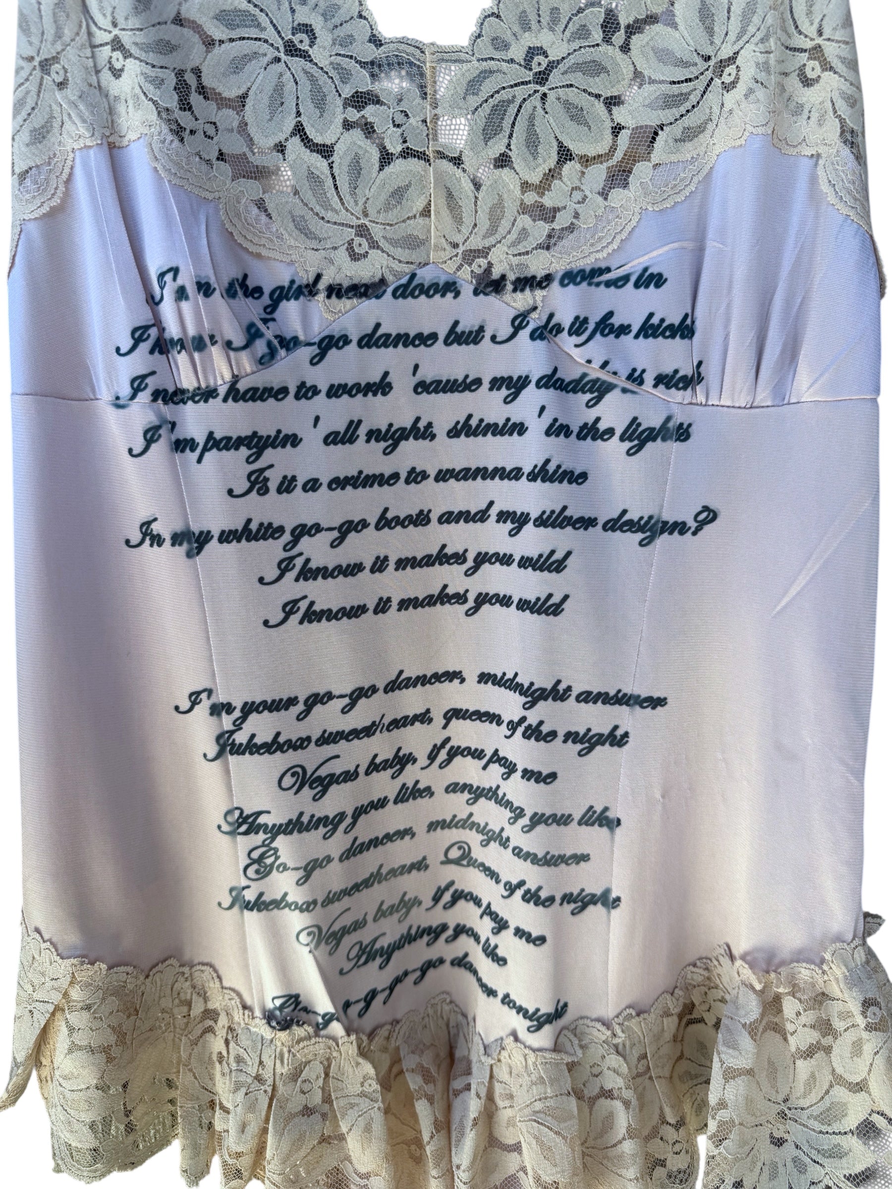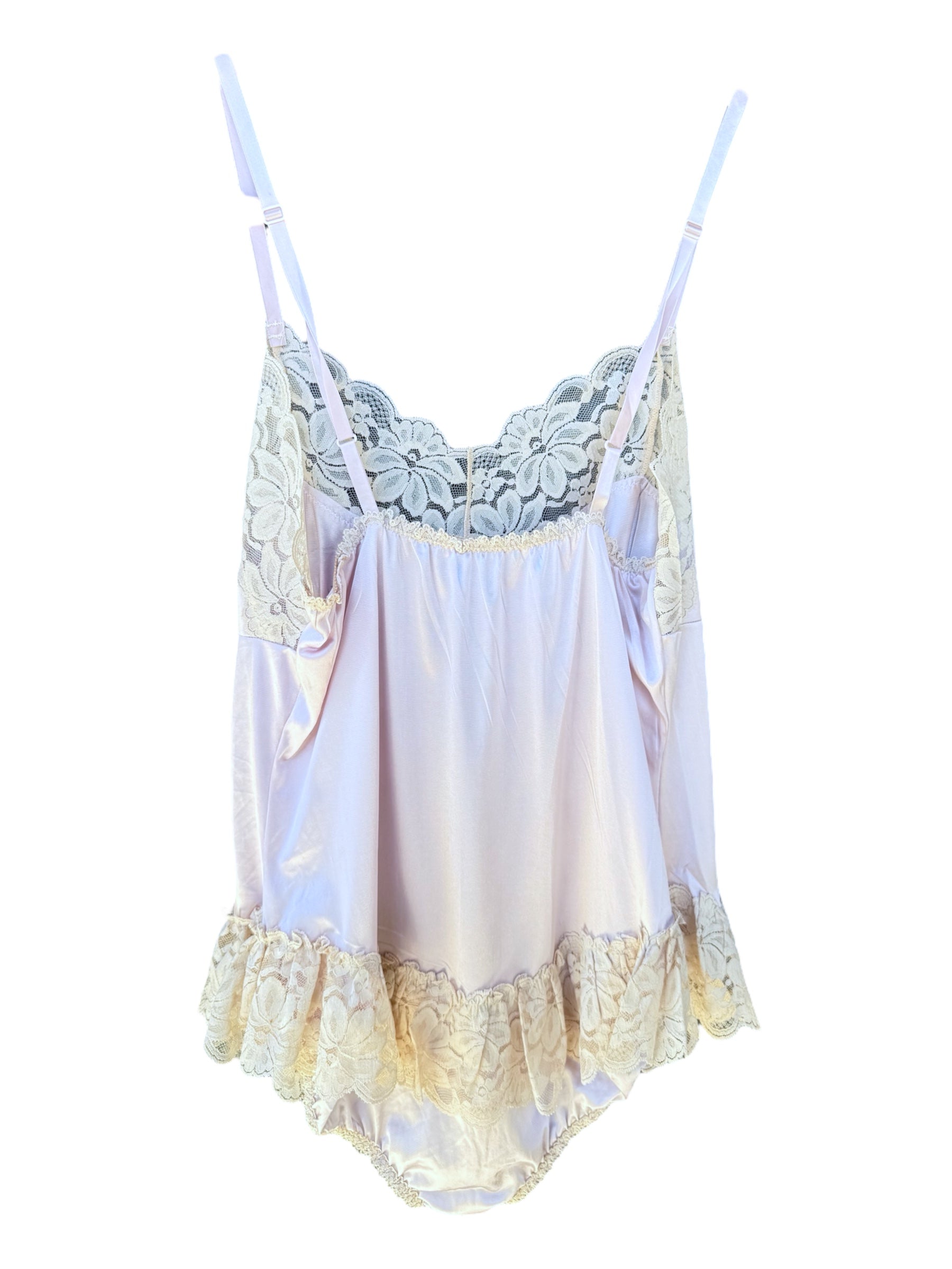 upcycled on deadstock 80s bodysuit with hand printed details l marked a size medium l lana del rey - go go dancer lyrics l stretchy l adjustable straps l color is hard to capture on camera, light tea colored lace with a very light lavender body