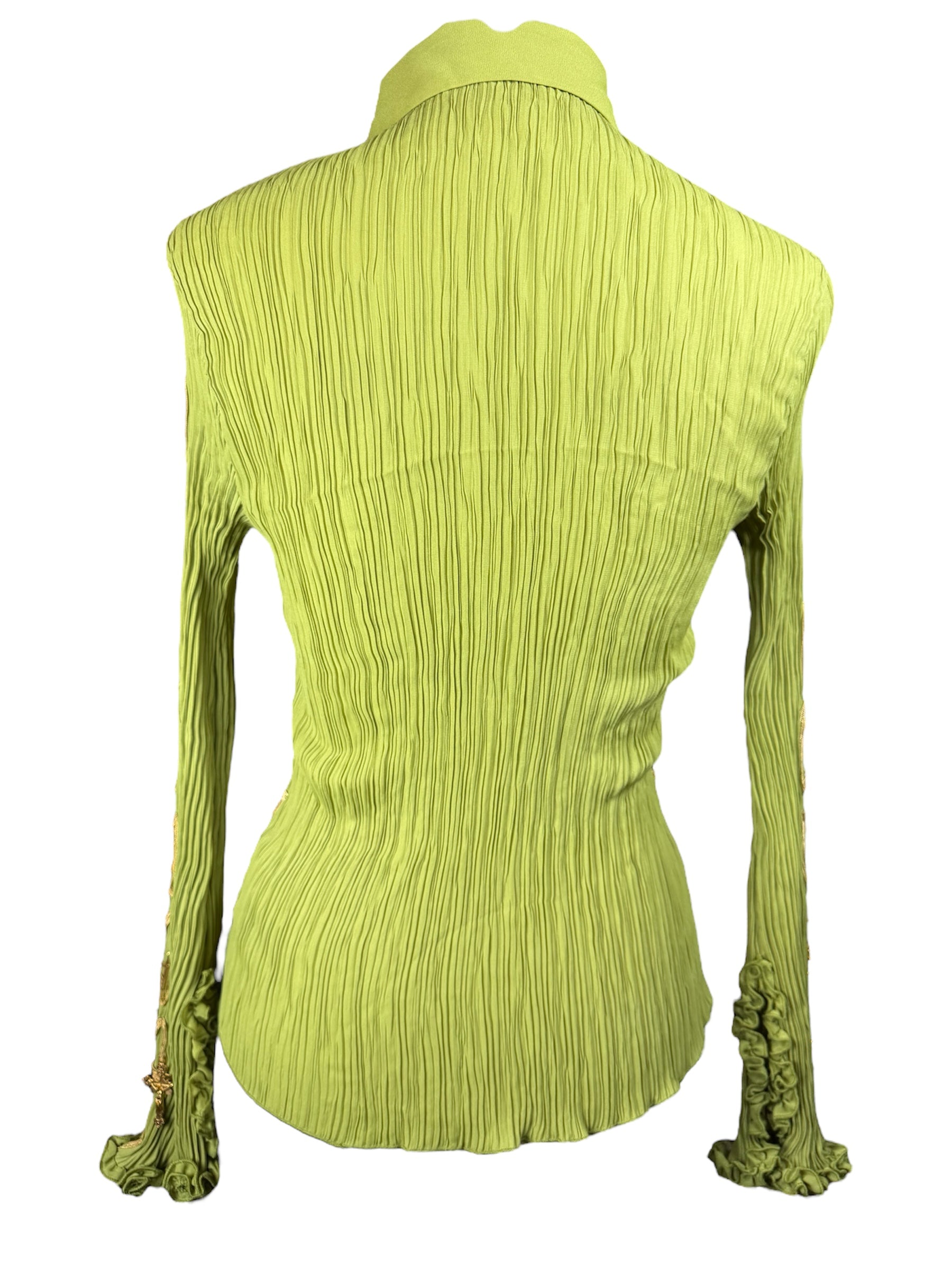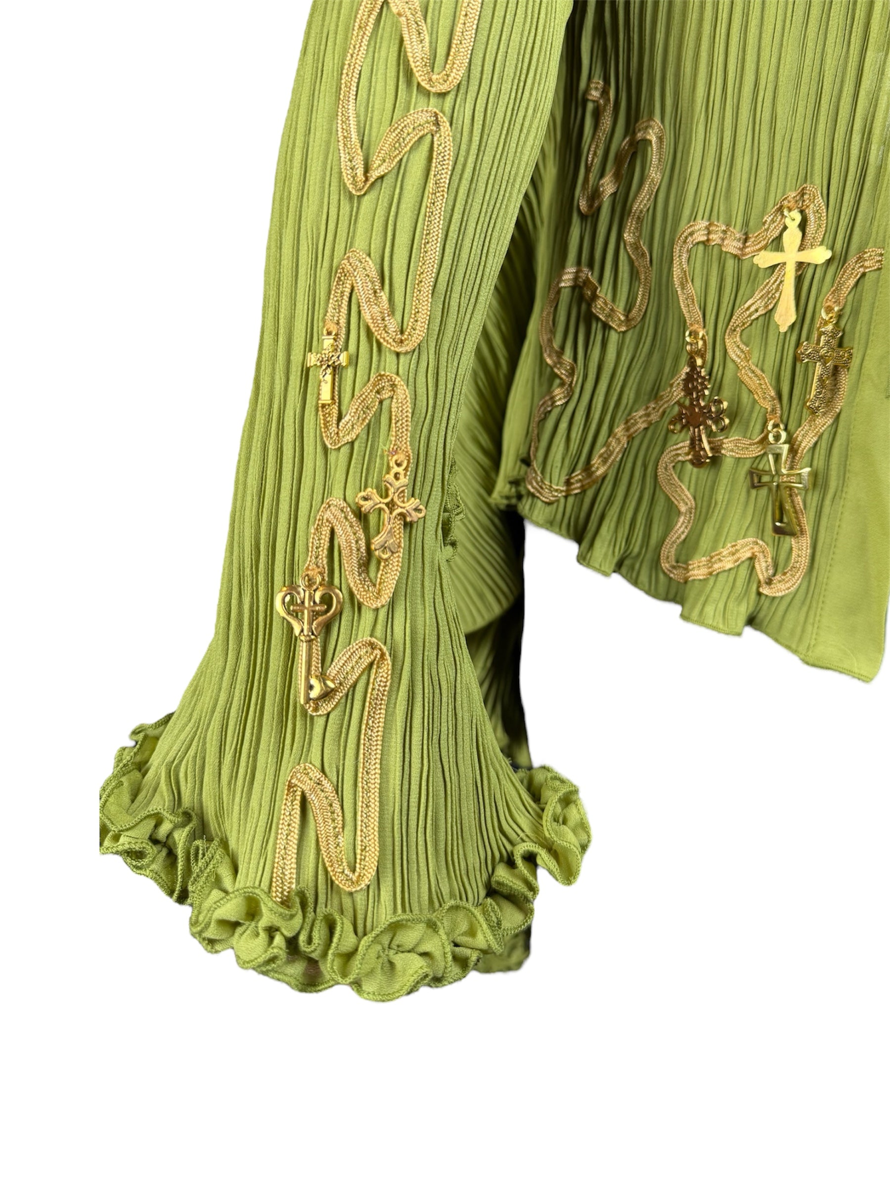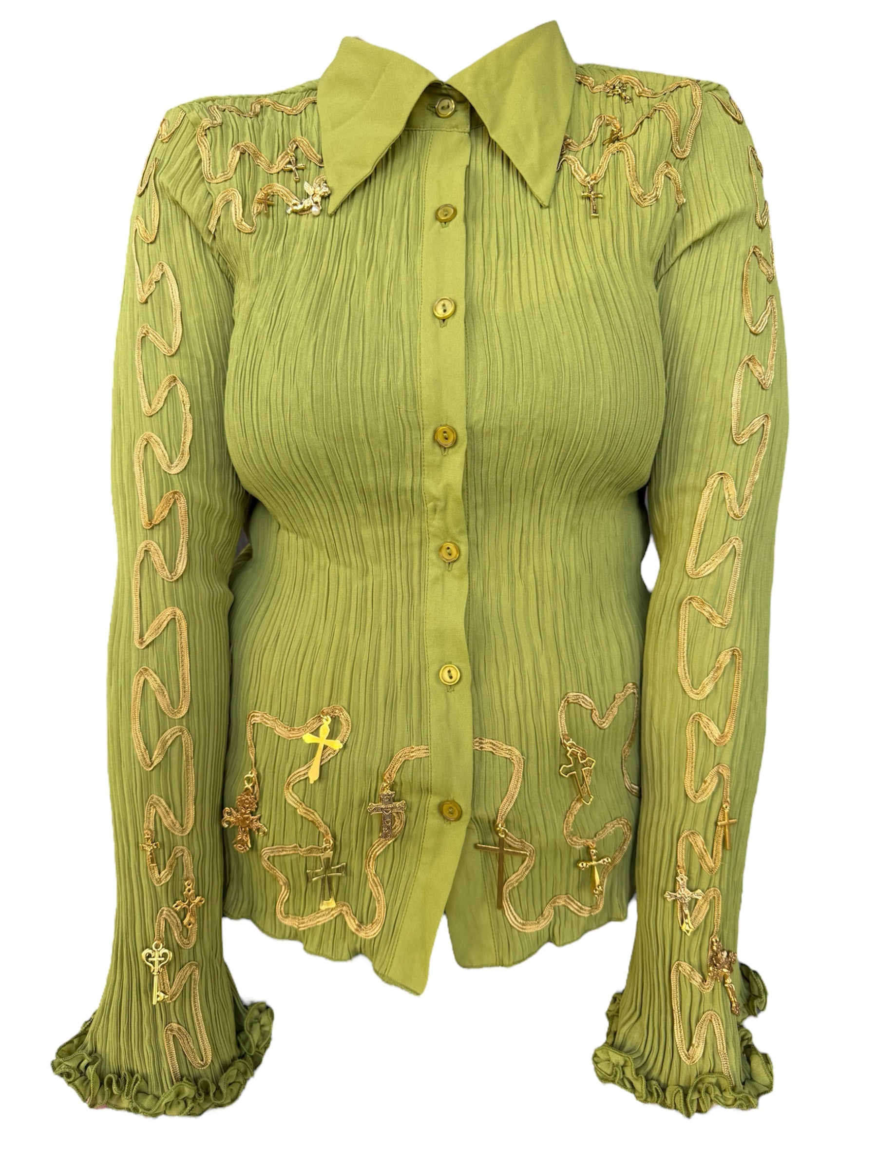 upcycled button up top with hand-sewn crosses & details l stretchy!