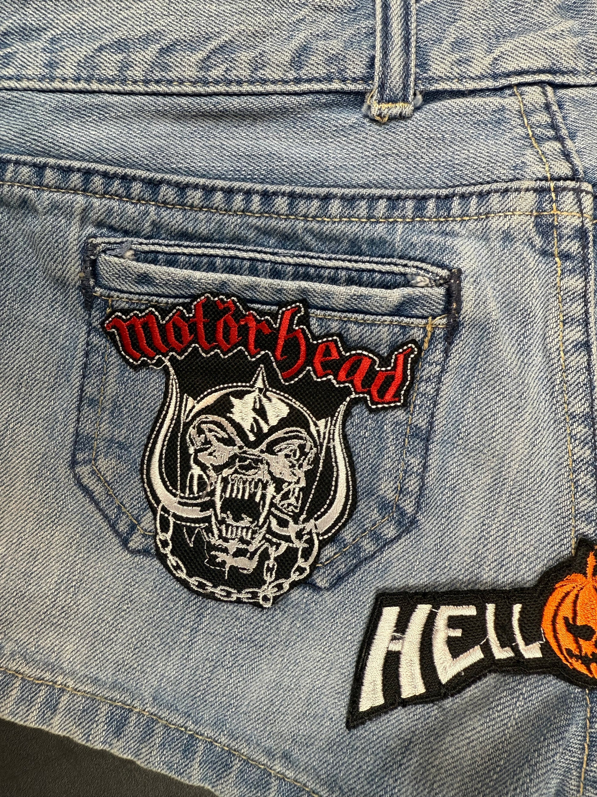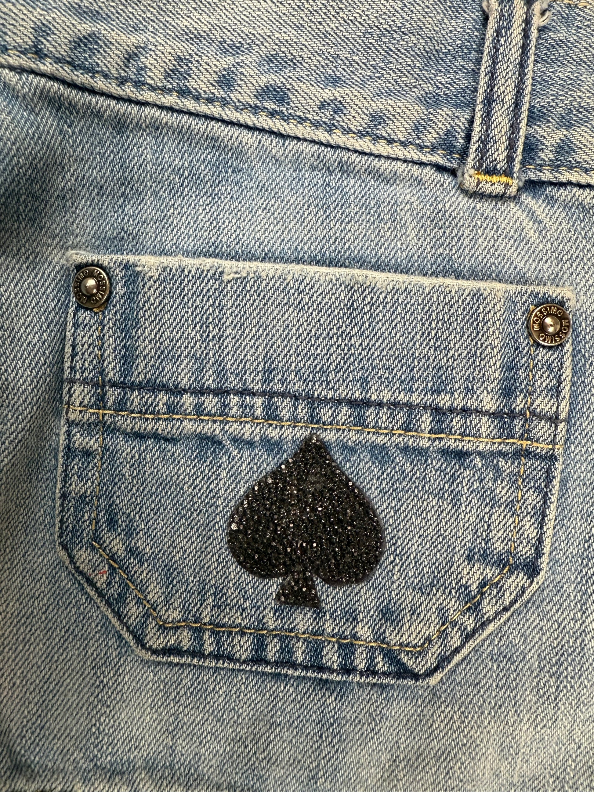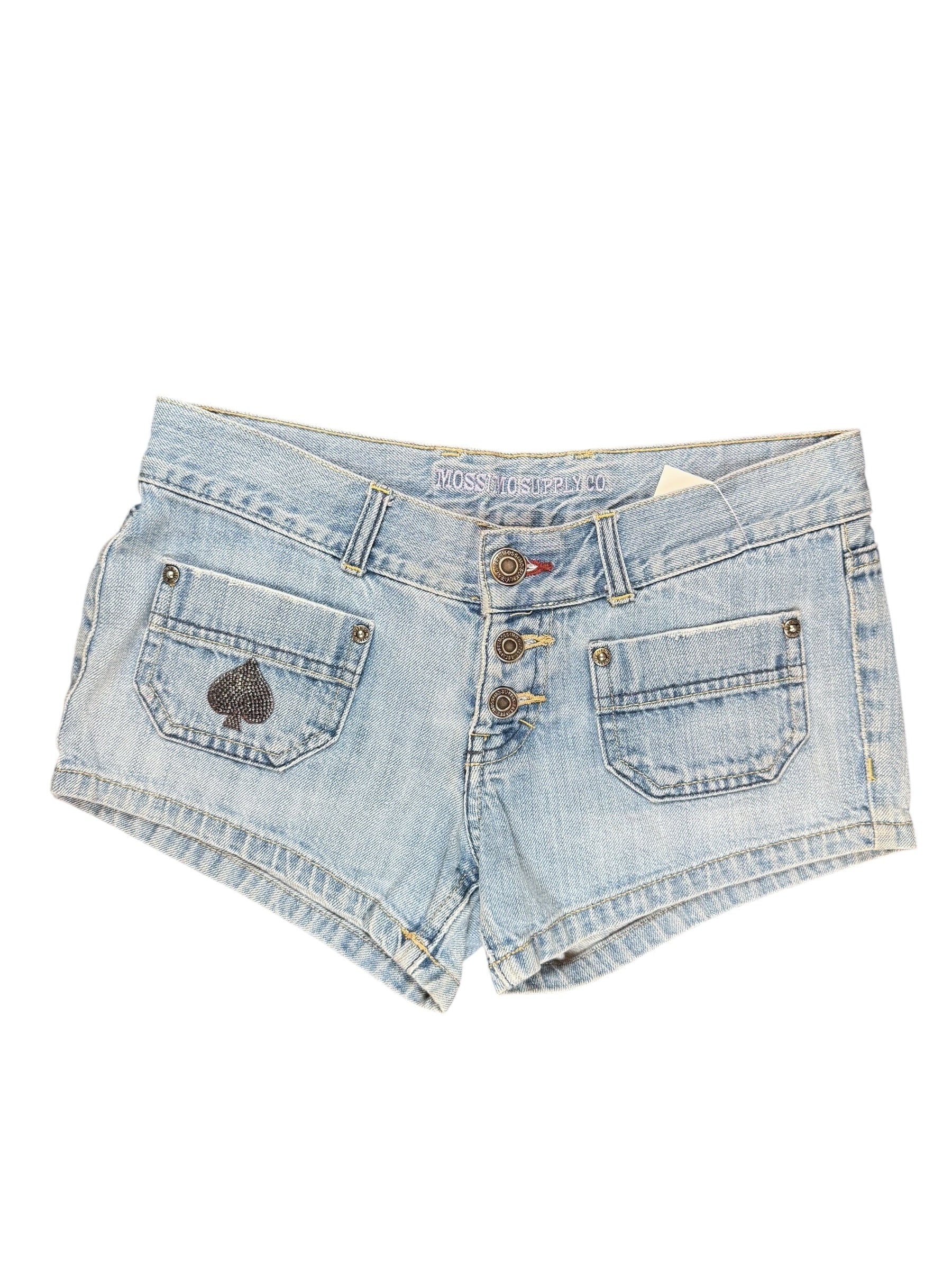 Vintage denim shorts with metal patches ironed on | low waist | button up closure l upcycled Y2K Mossimo l marked a size 5
