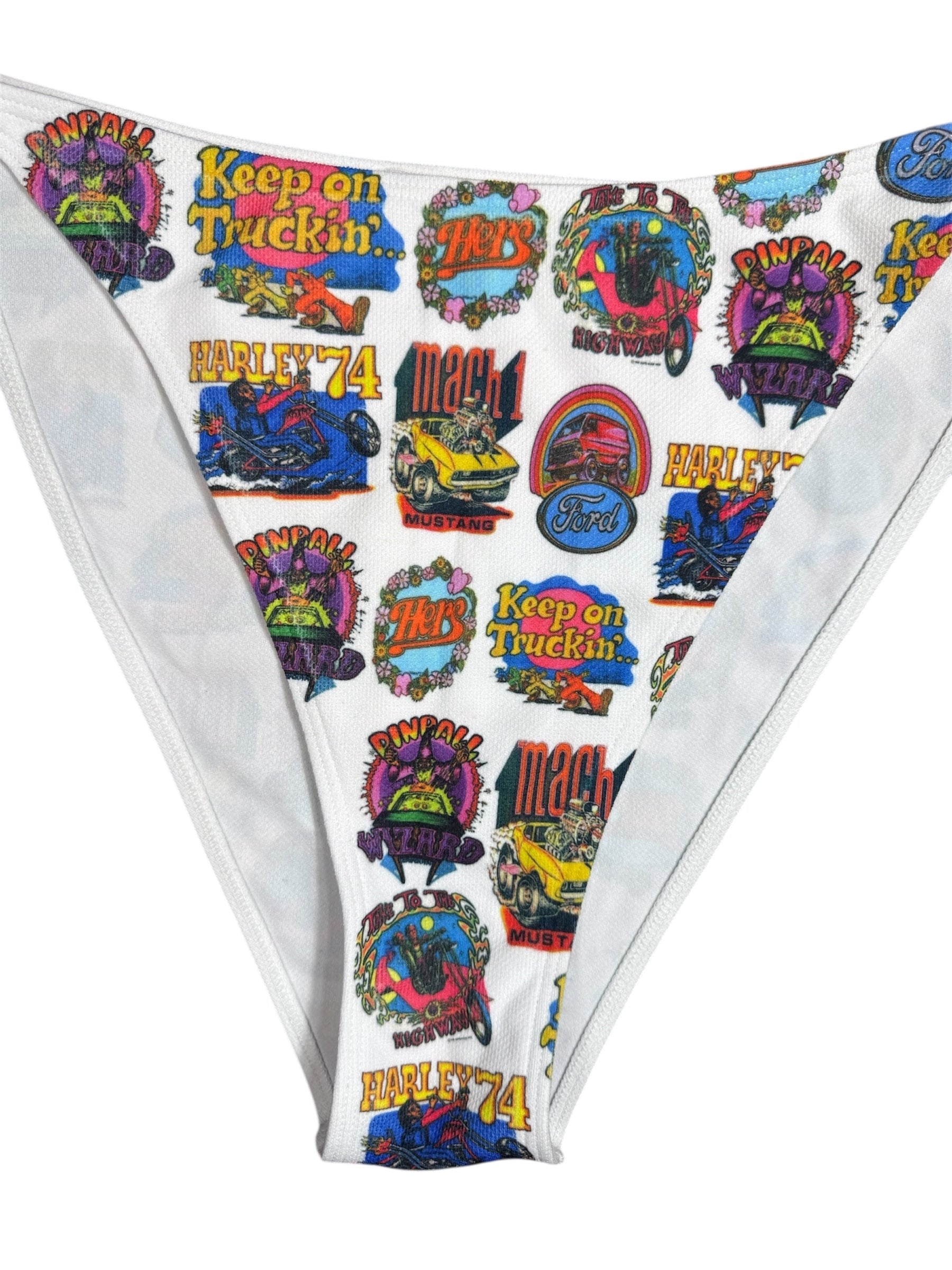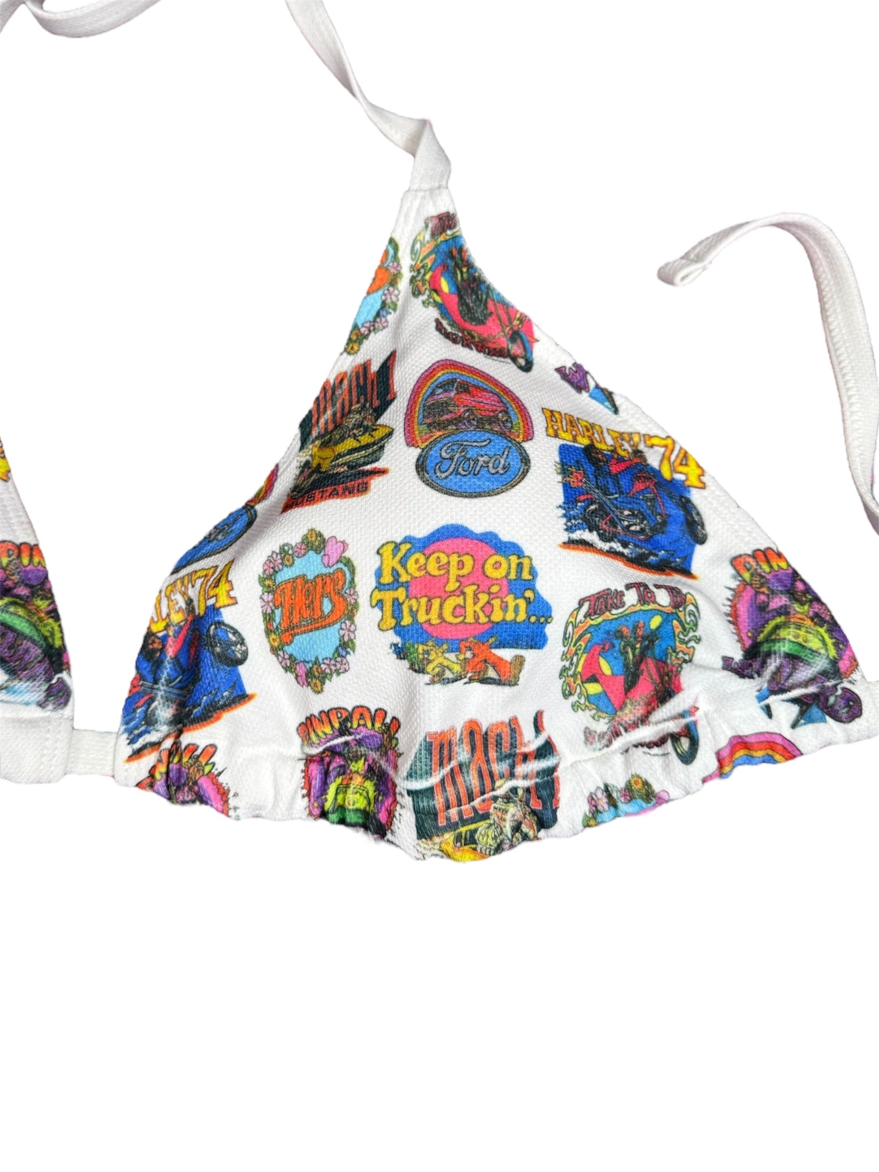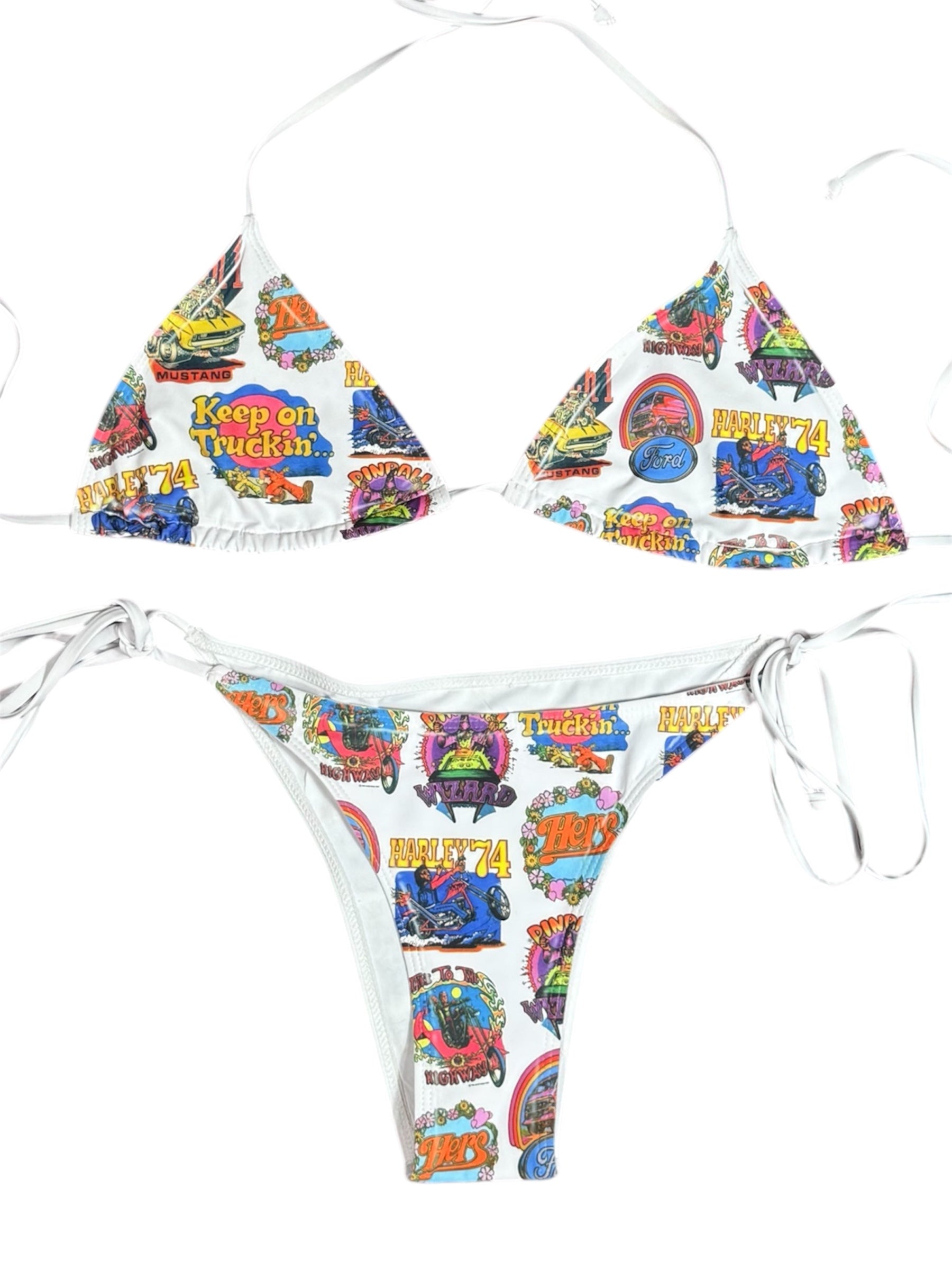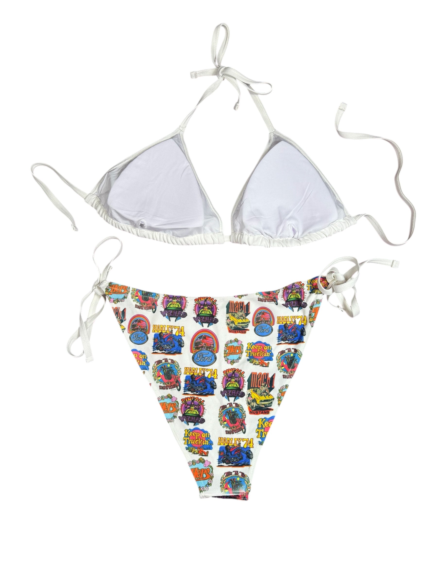 hand printed design on bikini. bikini will not be exact shown. slight differences and misprints vary due to nature of hand printed garment :)
