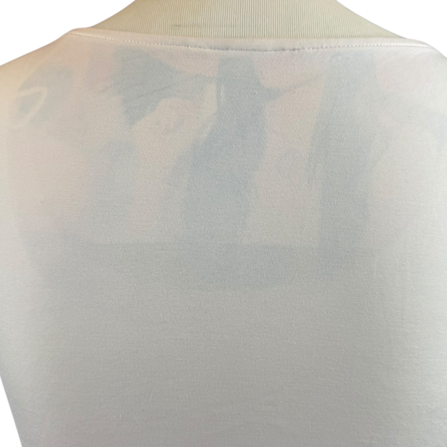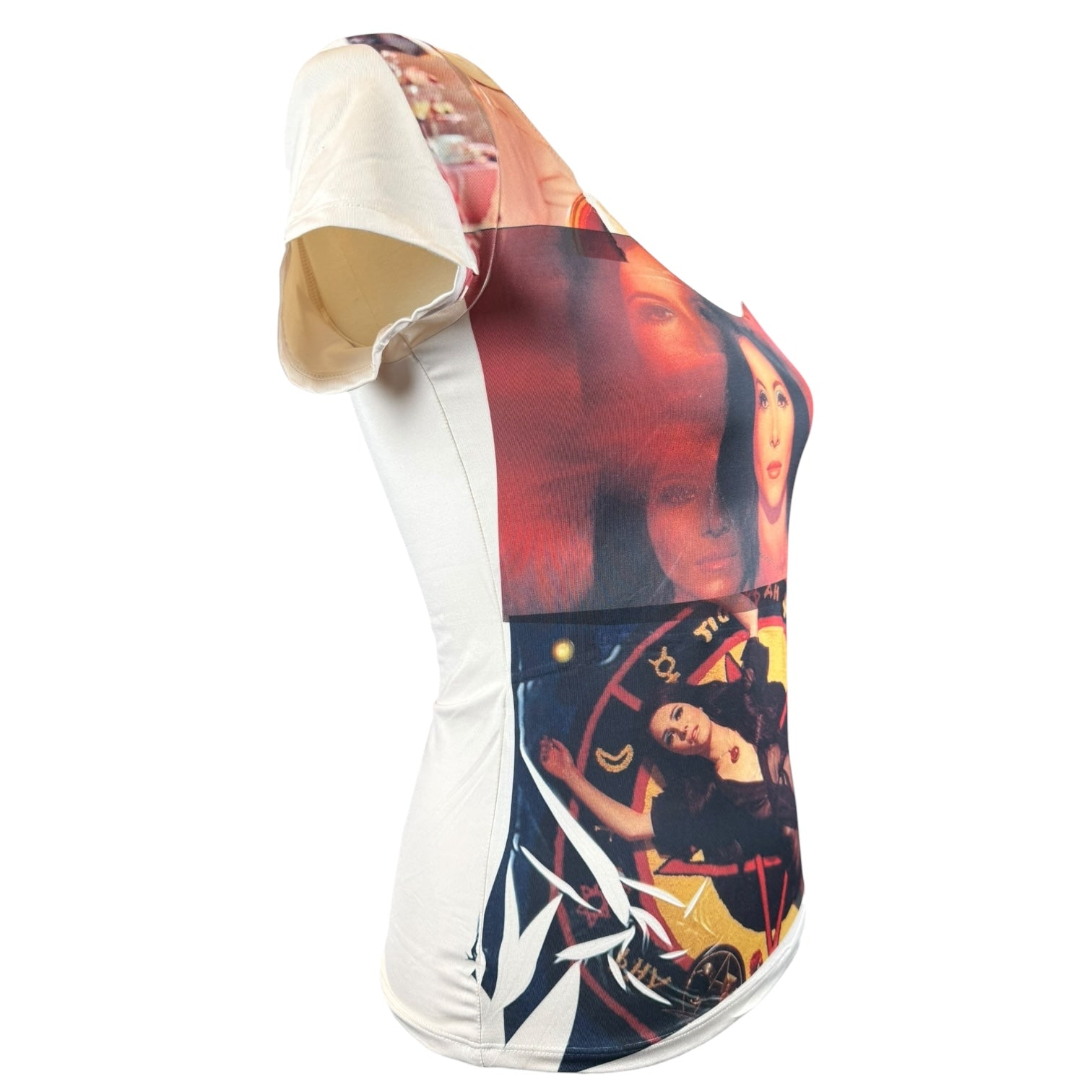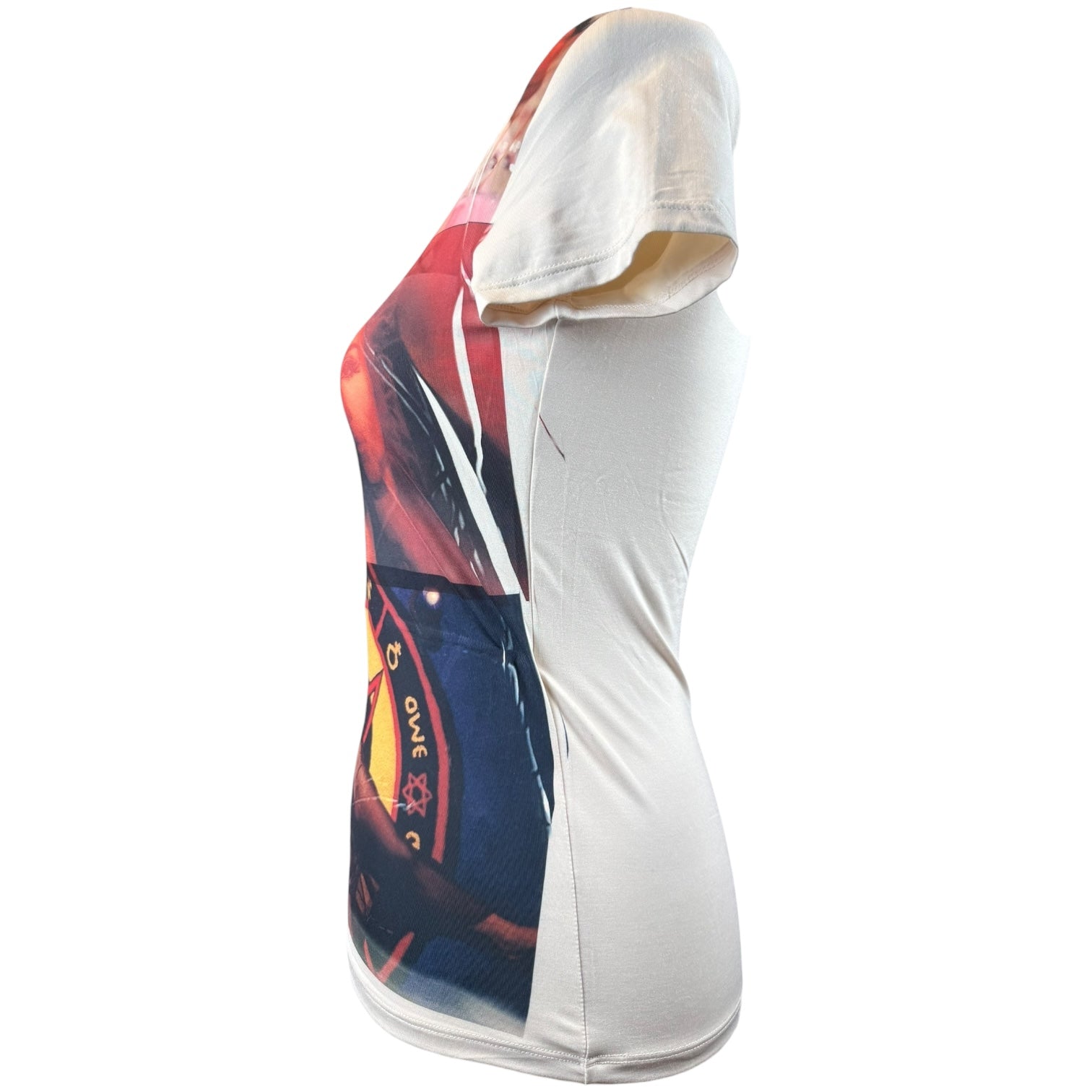 Upcycled stretchy tee shirt l misprint on back as shown, price reflected to sell.