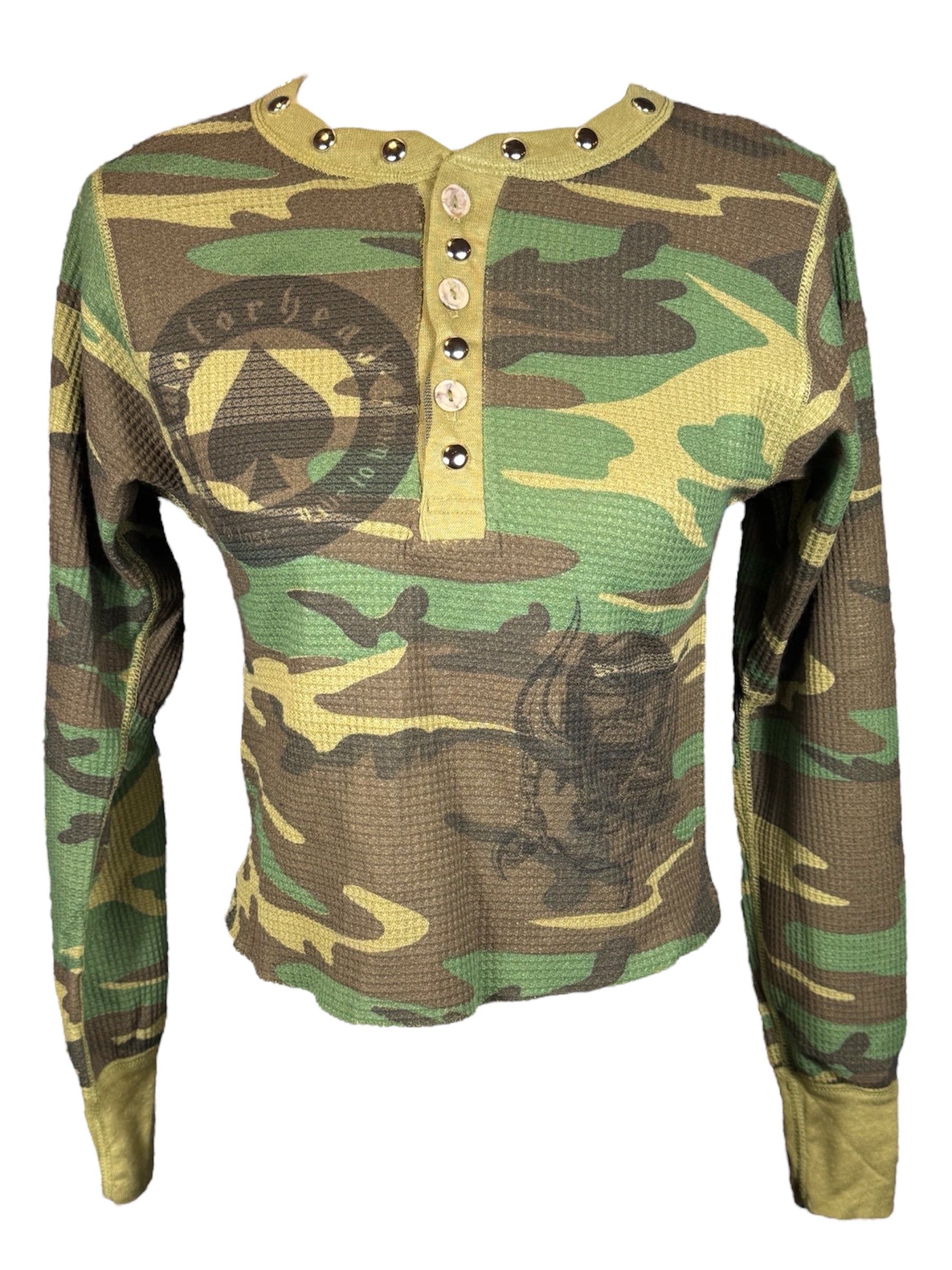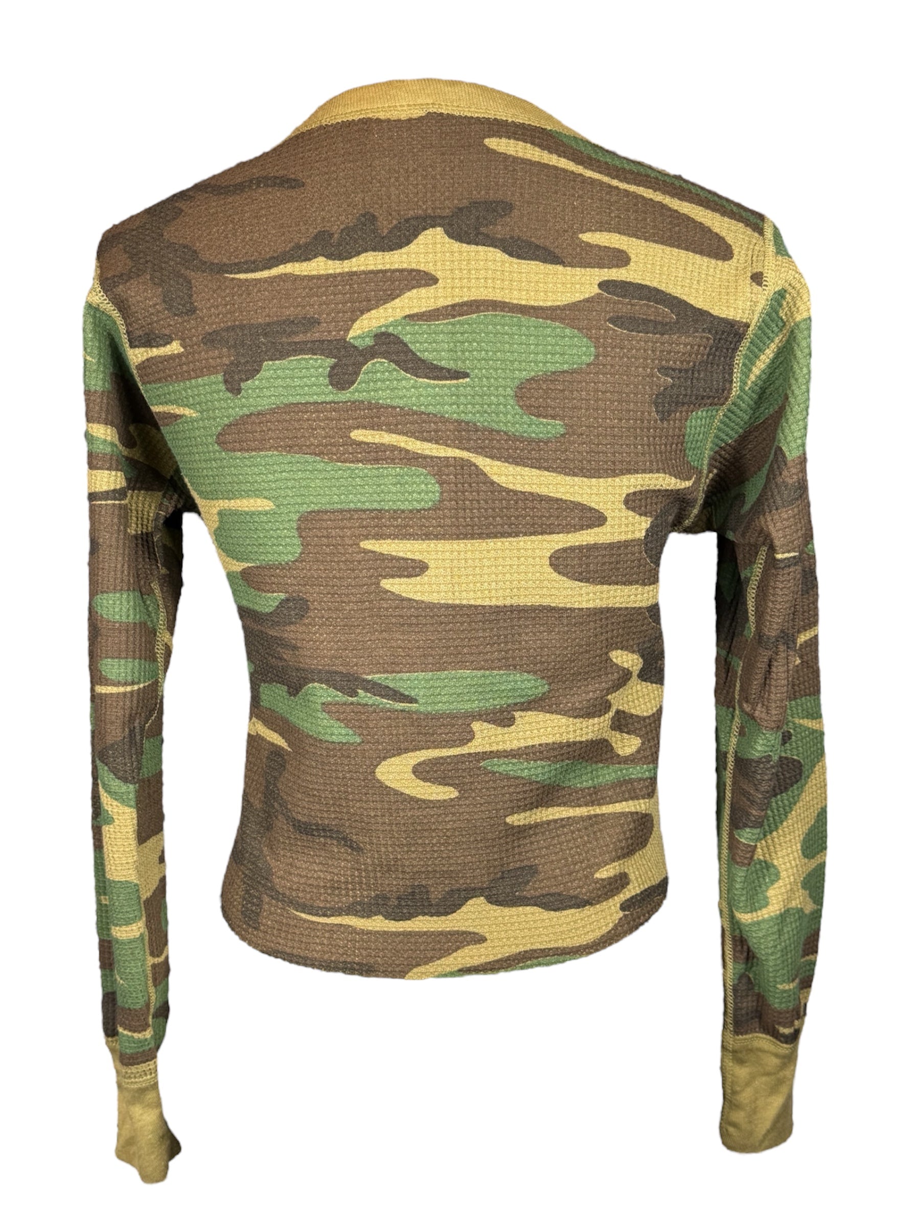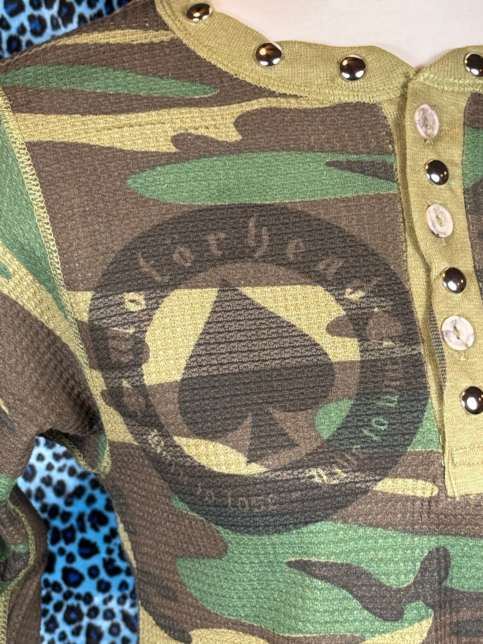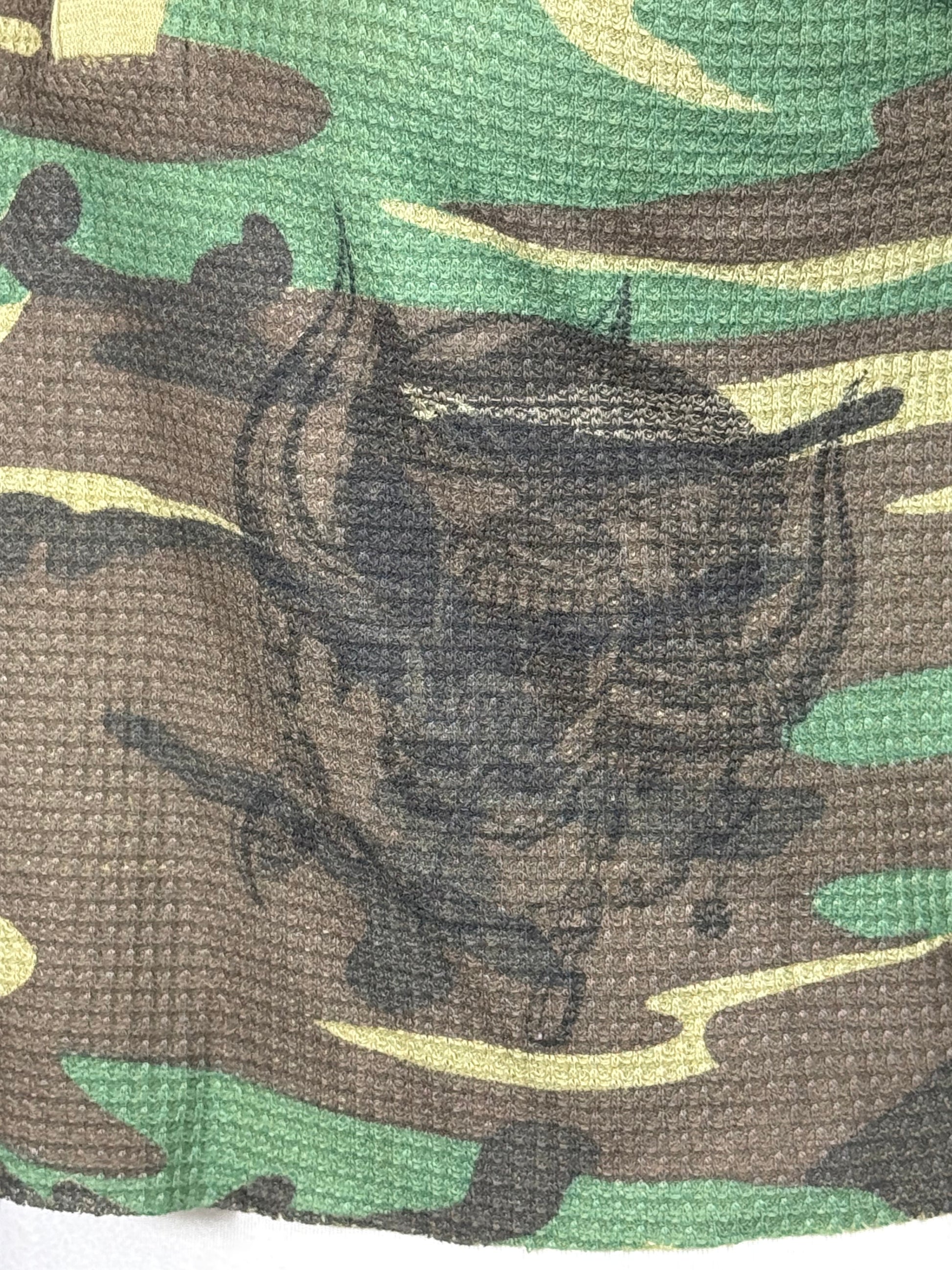 hand printed & hand studded on vintage 80's deadstock camo thermal l stretchy! l marked a size medium