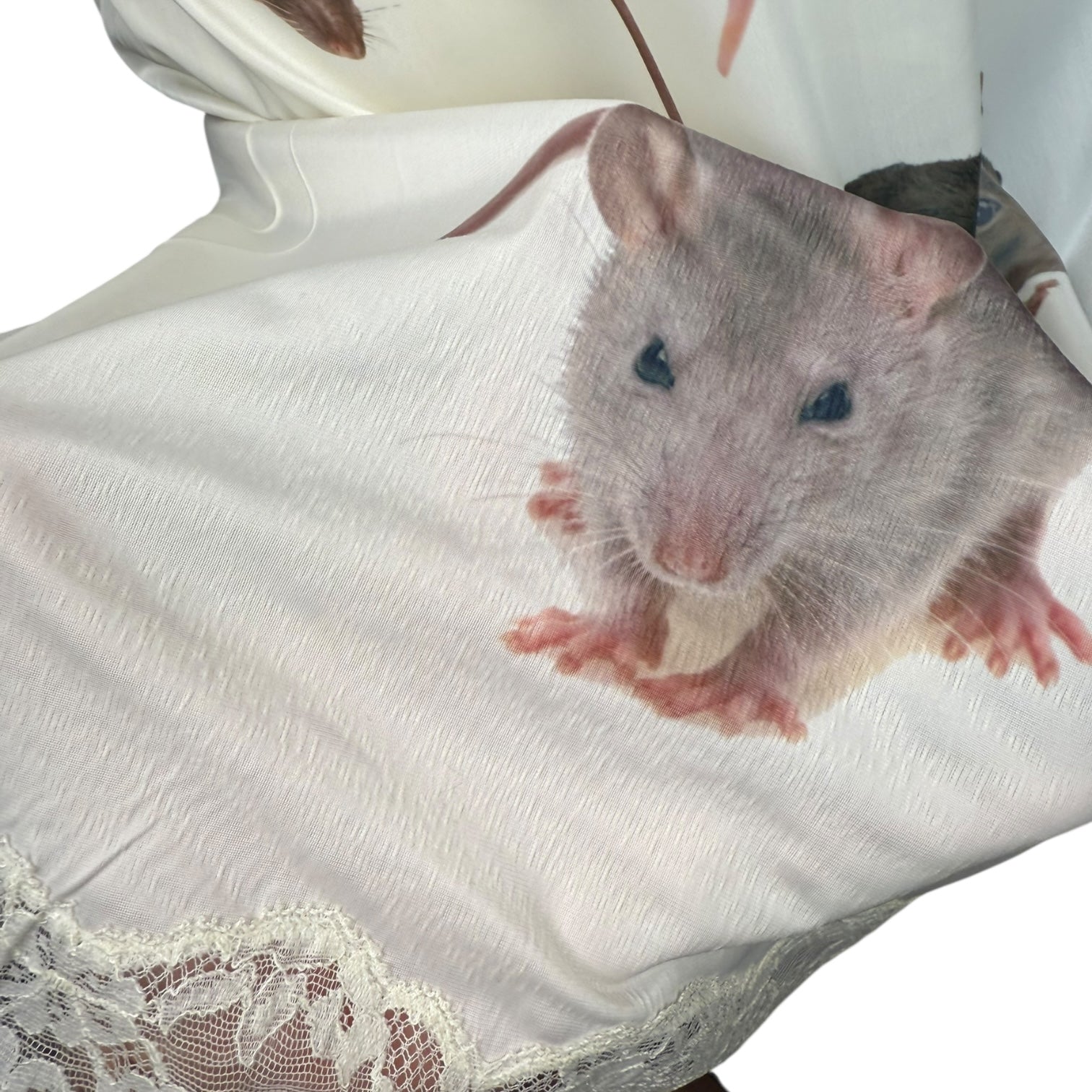Upcycled white hand printed dress l adjustable straps l marked a vintage size 36 l some stains, yellowing up on the upper part of the dress, and "crinkling" on bottom as shown in photos. Please be aware before buying. I have discounted this item to sell. This is a vintage garment, please be expected to have minor flaws and imperfections due to the age of the item.