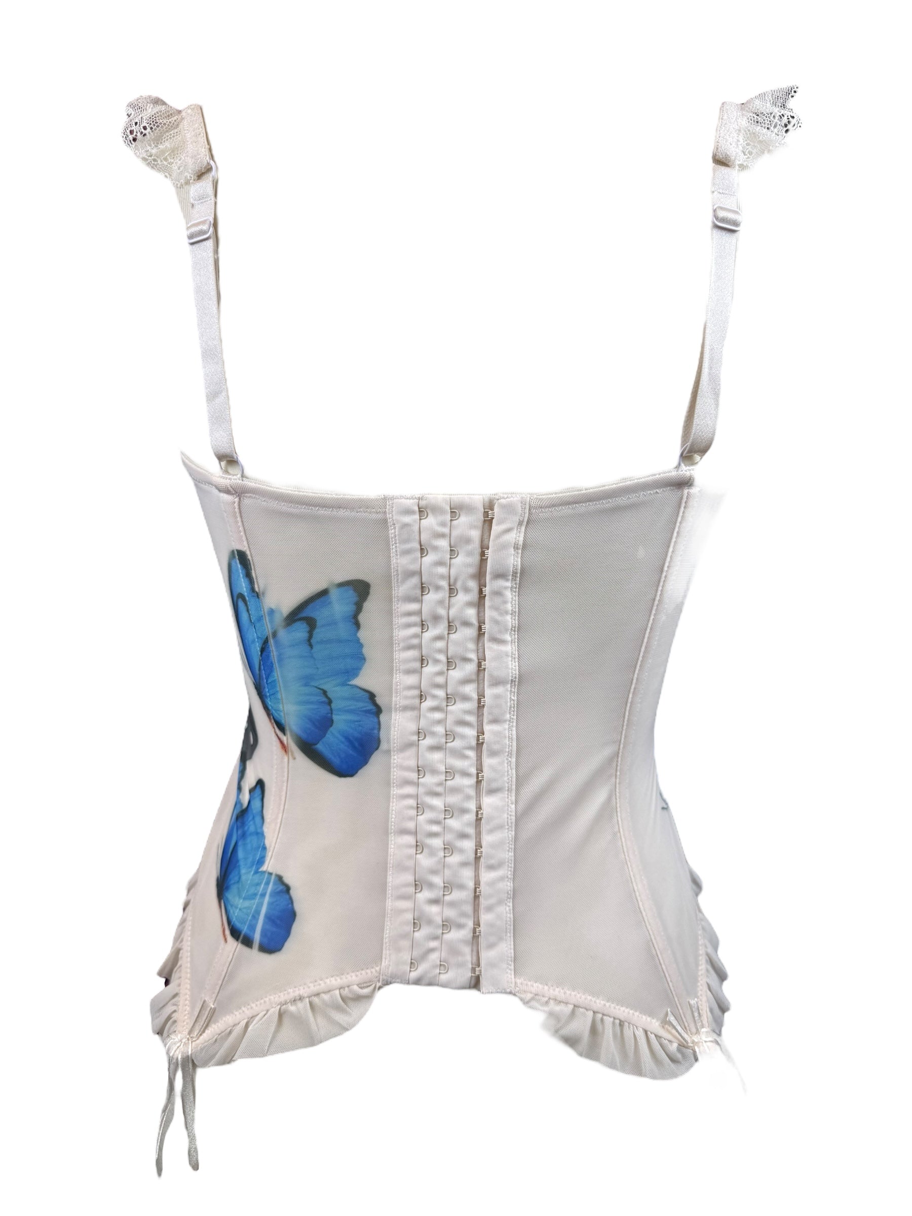 Upcycled corset top with hand printed design l stretchy l bra hook back