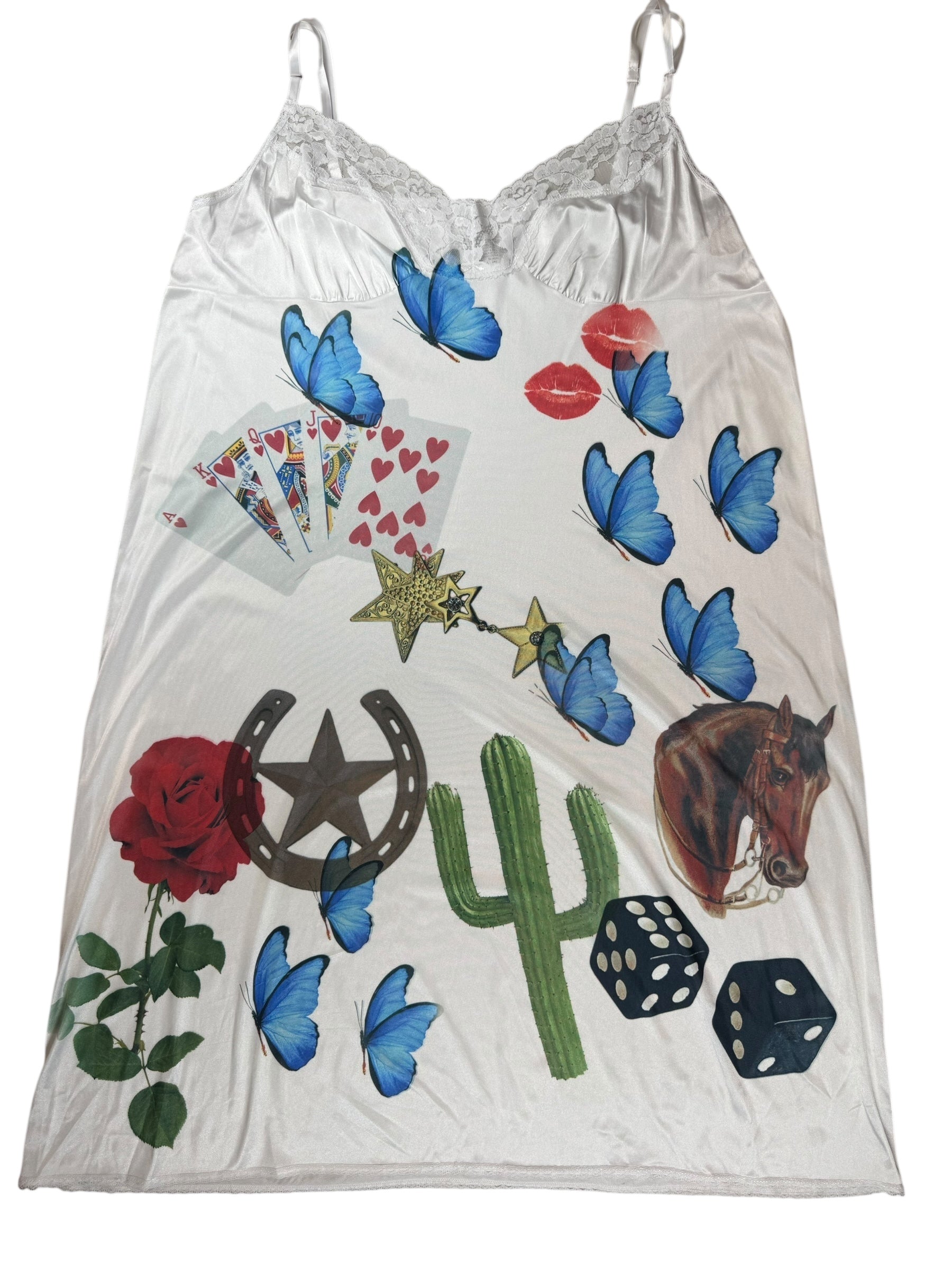 Upcycled white hand printed slip dress l adjustable straps l marked a size 44