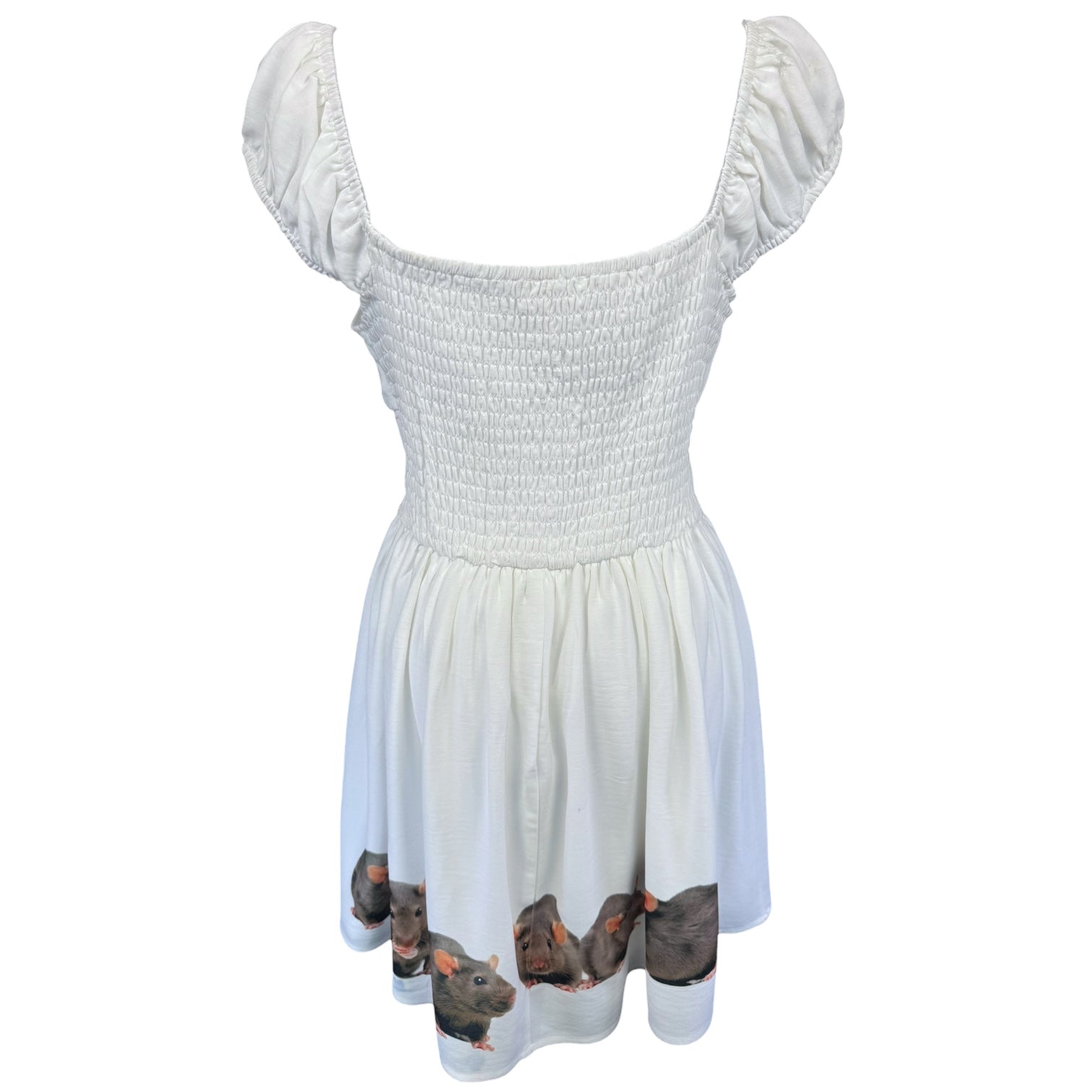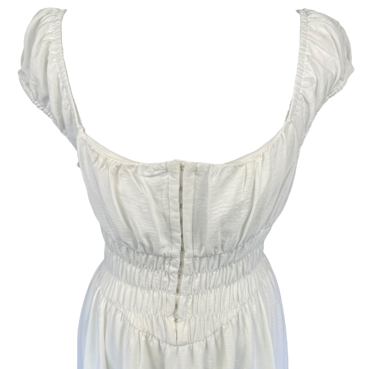 Upcycled white hand printed dress l metal front clasp closure l puffy sleeves with elastic openings l stretchy back l